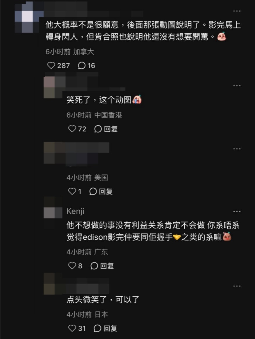 不過由於網民是以動態相片方式分享,意外披露陳冠希影完相即秒轉身閃人,有網民就認為他似乎不是很願意合照:「他大概率不是很願意,後面那張動圖說明了。影完馬上轉身閃人,但肯合照也說明他還沒有想要開罵。」、「好像有點勉強」、「他咬牙了,再過多一秒就該打你了」。但亦有粉絲護航:「人家只是酷酷的而已,表情已經很善意了,還點頭示意離開」、「至少肯合影算不錯了」、「都有點頭微笑了,可以了~」然而有趣的是,有另一位女網民分享同日捕獲陳冠希的合照,照片中,陳冠希親切地搭著女粉絲的肩膀,並露出燦爛笑容,與男網民的合照成強烈對比,難怪網民調侃:「上一張和男生合照,拍完轉身就走」。
