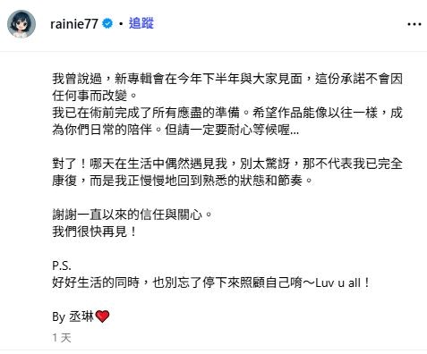 工作狂突如其來要停下腳步,楊丞琳特別感謝媽媽和老公李榮浩寸步不離地在身旁陪伴照顧,讓她得以安心休養:「雖然不太想讓這段經歷顯得太沉重,但這確實不是件小事。現階段是一個需要時間、也讓我必須暫時停下腳步的必經過程。因為比較少露面,不想你們擔心或誤解,所以還是決定跟大家分享。母親和先生都在身旁陪伴與照顧,你們安心,沒事的喔!」