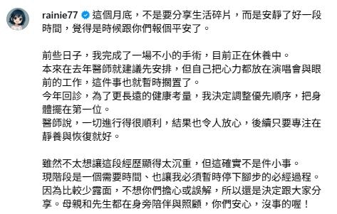 楊丞琳透露自己剛做完大手術。(IG:@rainie77)