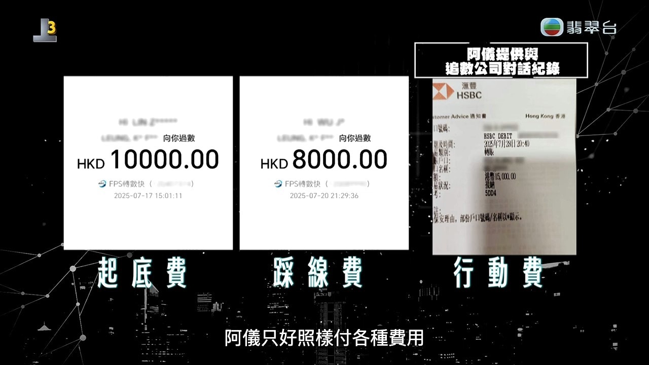 其後,公司以需要起底,搵人在債仔居所附近等候,及上門費等理由,向梁小姐索取3筆分別一萬、八千及一萬五千港元款項。梁小姐不虞有詐照樣付款,其後,有關人士即時「做嘢」,表示已搵到債仔並成功將債仔捉到酒店房中,逼其寫下欠條。梁小姐表示,當時有關追數公司曾拍片及影相給她,不過就極其模糊,畫面灰暗。