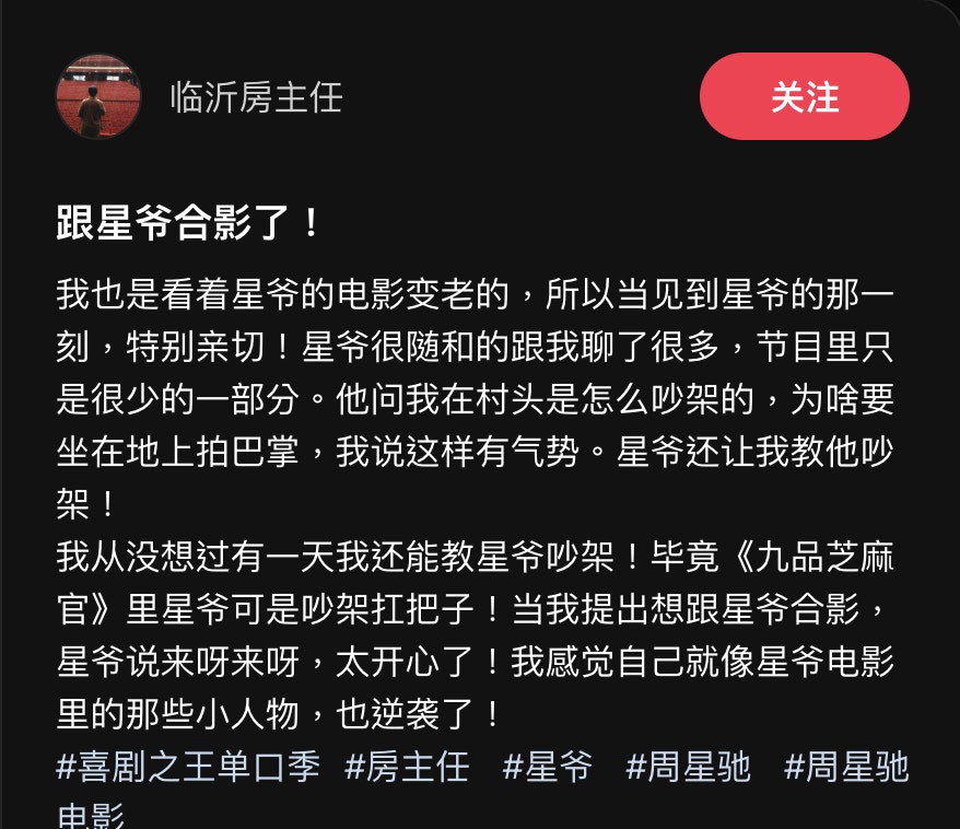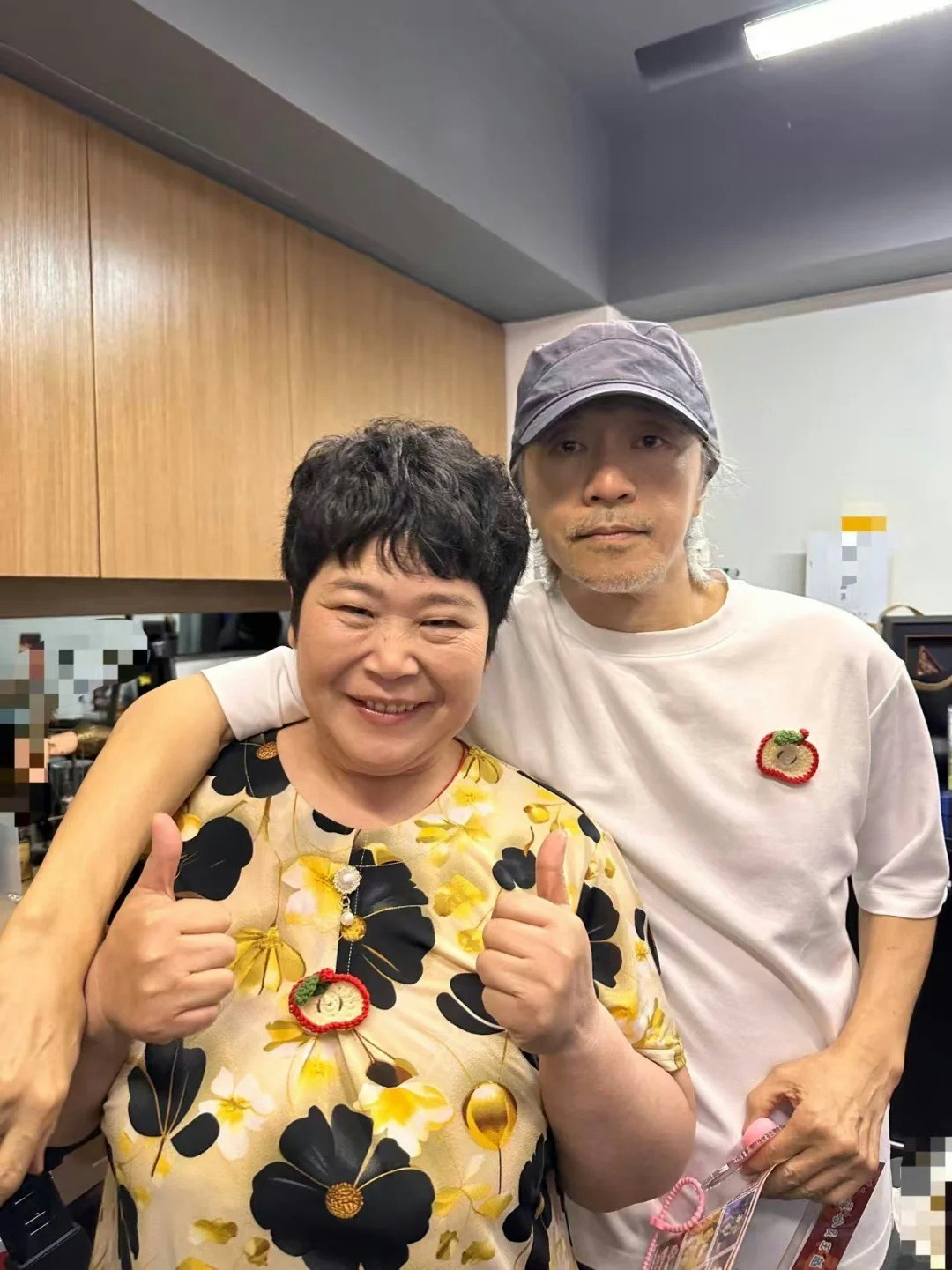 可以見到星爺本尊,當然是興奮不已。房主任在社交平台曬出與星爺的合照,照片中星爺面容輕鬆,親切地搭著房主任的肩膀,打破了他一貫的神秘形象。房主任則豎起兩隻大姆指兼笑到見牙不見眼,在帖文中也難掩激動之情,她以「跟星爺合影了」為題,寫道:「我也是看着星爺的電影變老的,所以當見到星爺的那一刻,特別親切!」