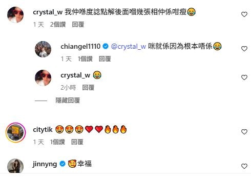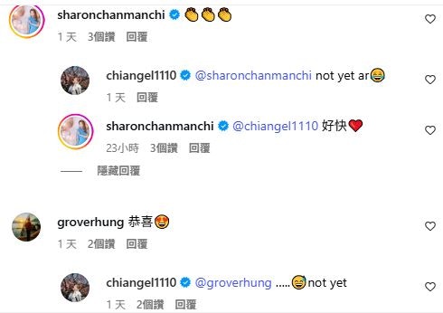 有眼利網民好奇留言「我仲喺度諗點解後面嗰幾張相仲係咁瘦」蔣家旻親自留言幽默回應:「咪就係 因為根本唔係」。陳敏之也立即送上祝福,不過蔣家旻則即時回覆「not yet ar」,陳敏之一句「好快!」更添懸念, 甚至有網民推測蔣家旻或是暫不公開懷孕的喜訊。
