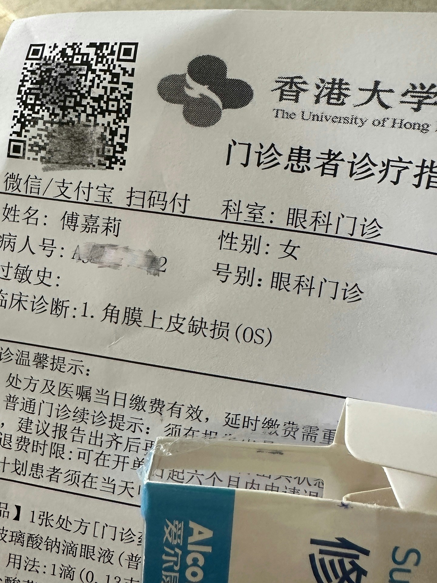 暫時傅嘉莉只能先好好休息,待眼角膜情況變好:「滴了很多麻醉眼藥水和打了止痛針,才可以勉強打開眼睛。換了一個新的角膜保護膜。現在先睡一會,希望起來眼睛會變好了…原來對某隻抗生素敏感是包括所有含這一種成份的藥物,不一定口服,外用的也要注意。收縮眼晴血管藥也不能隨便用,效果只維持短時間之後會爆發式爆紅根。不能看輕每一個小病小問題,幸好傷口不在我的瞳孔附近,滴眼藥水的時候雙手必定要潔淨。」