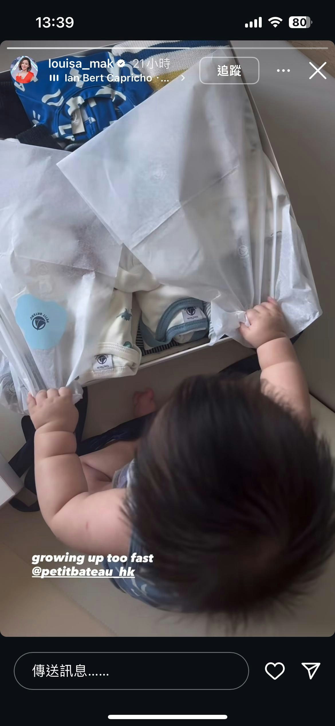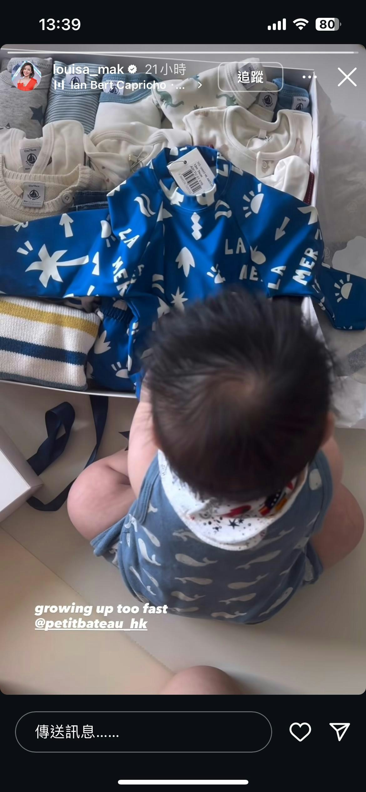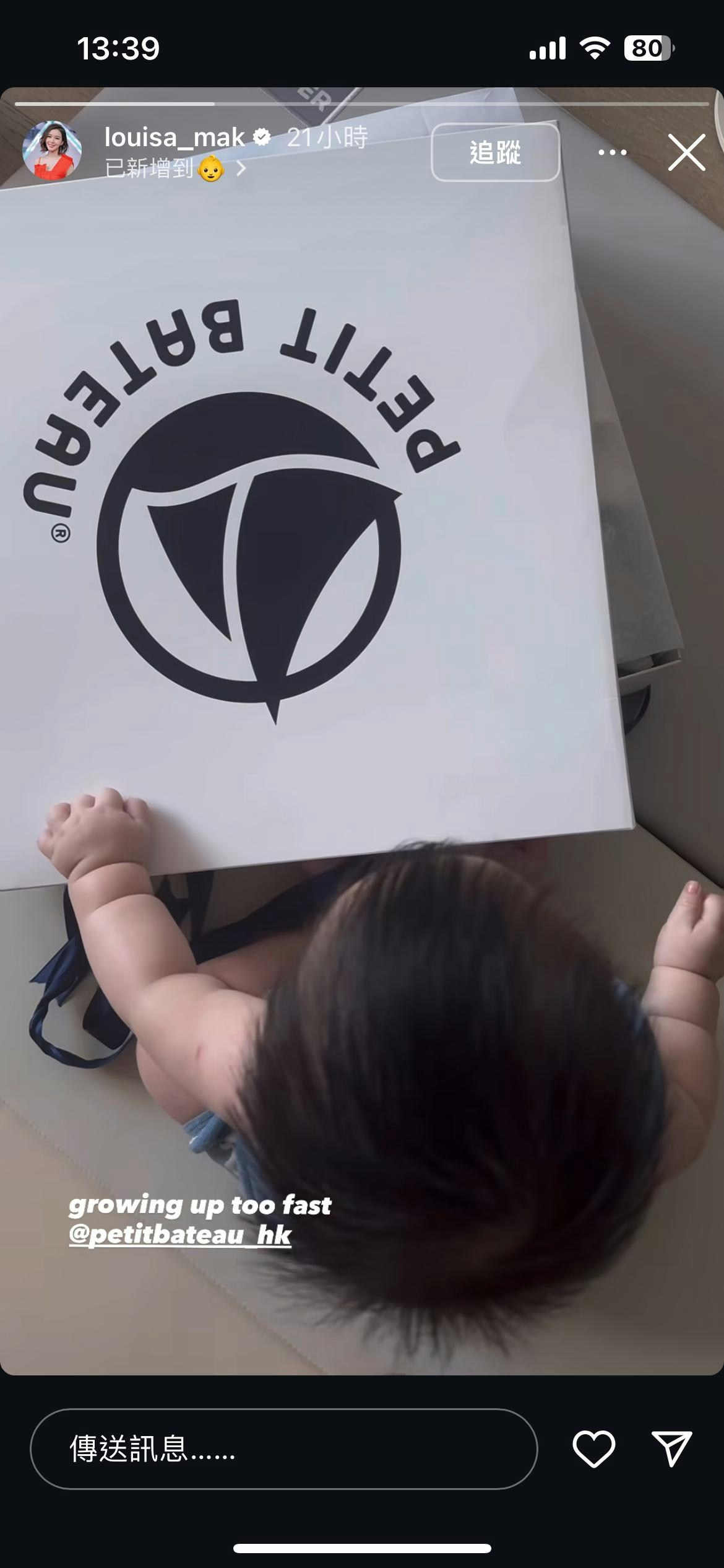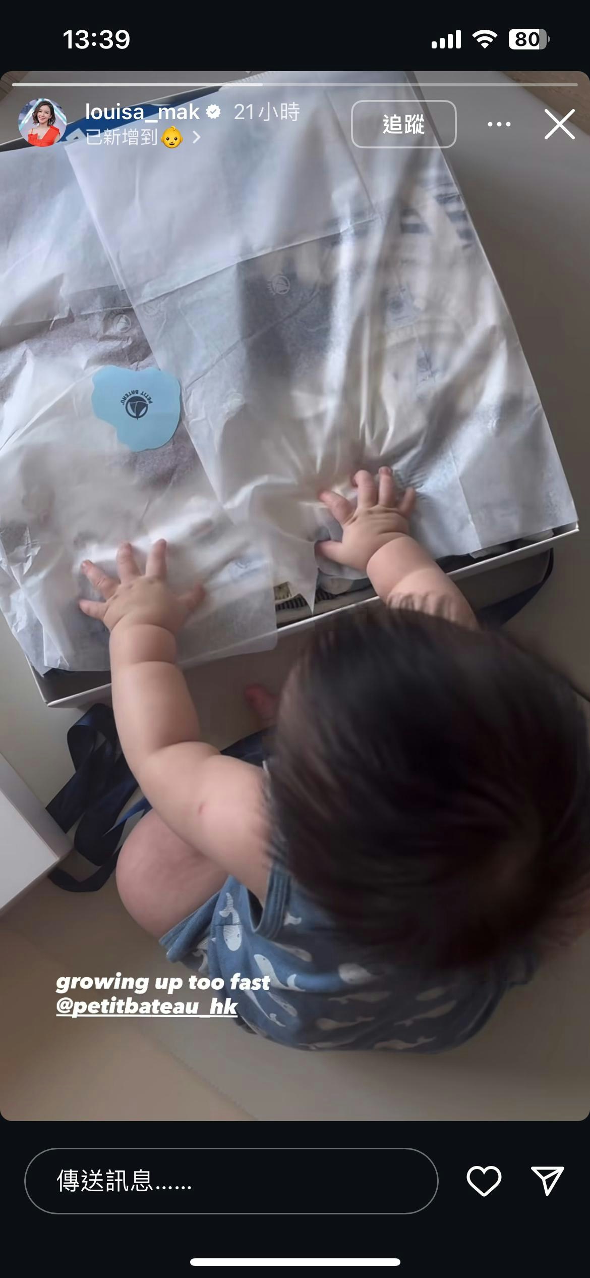 麥明詩的仔仔可以說是集萬千寵愛在一身,他還未出世時已獲大量品牌送贈禮物,嬰兒用品和bb衫等,而他出世後繼續不時會收到品牌送贈的禮物,可說是相當得寵。昨日麥明詩就於她的IG story分享了仔仔坐地上拆禮物的片段。從片中由上往下影的角度可見,她仔仔有好多頭髮,手仔腳仔都是肥嘟嘟一節節的,相當之肥美,就像那種一節節的長條型麵包,真是似十足米芝蓮般可愛。麥明詩仔仔看見一大盒禮物表現得十分興奮,也懂得用手去拆開,在他媽咪的協助下他總算拆禮物成功,解鎖了新技能,好叻叻。有網民就羨慕bb頭髮濃密。