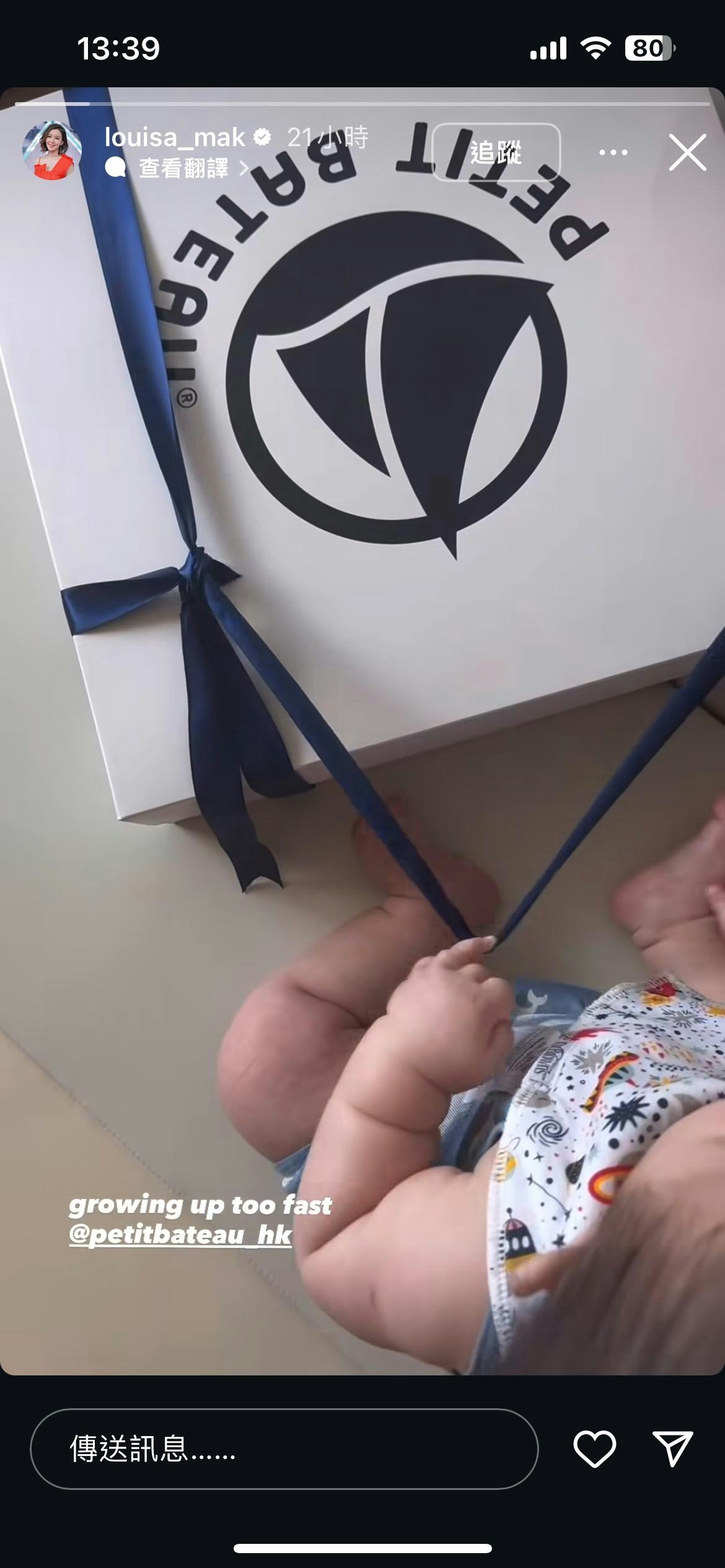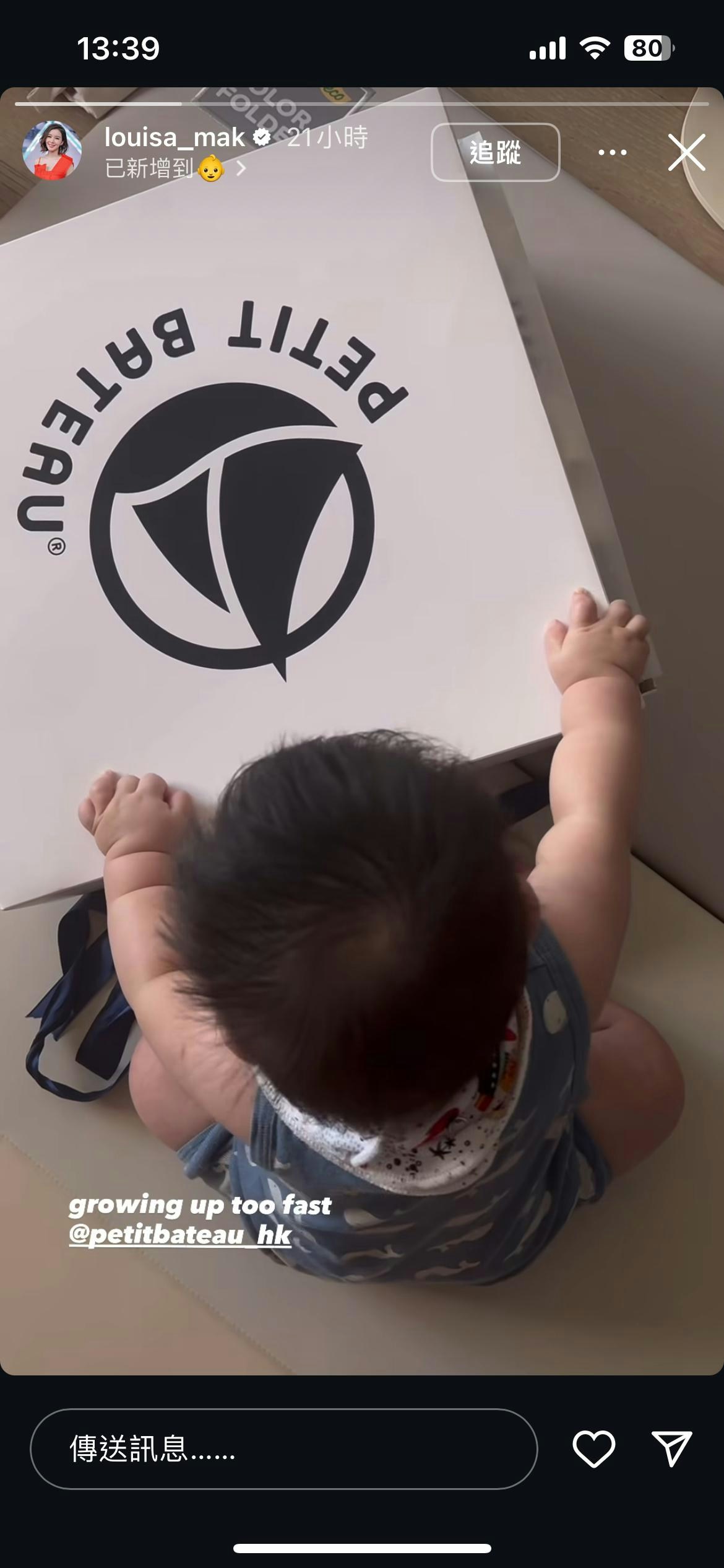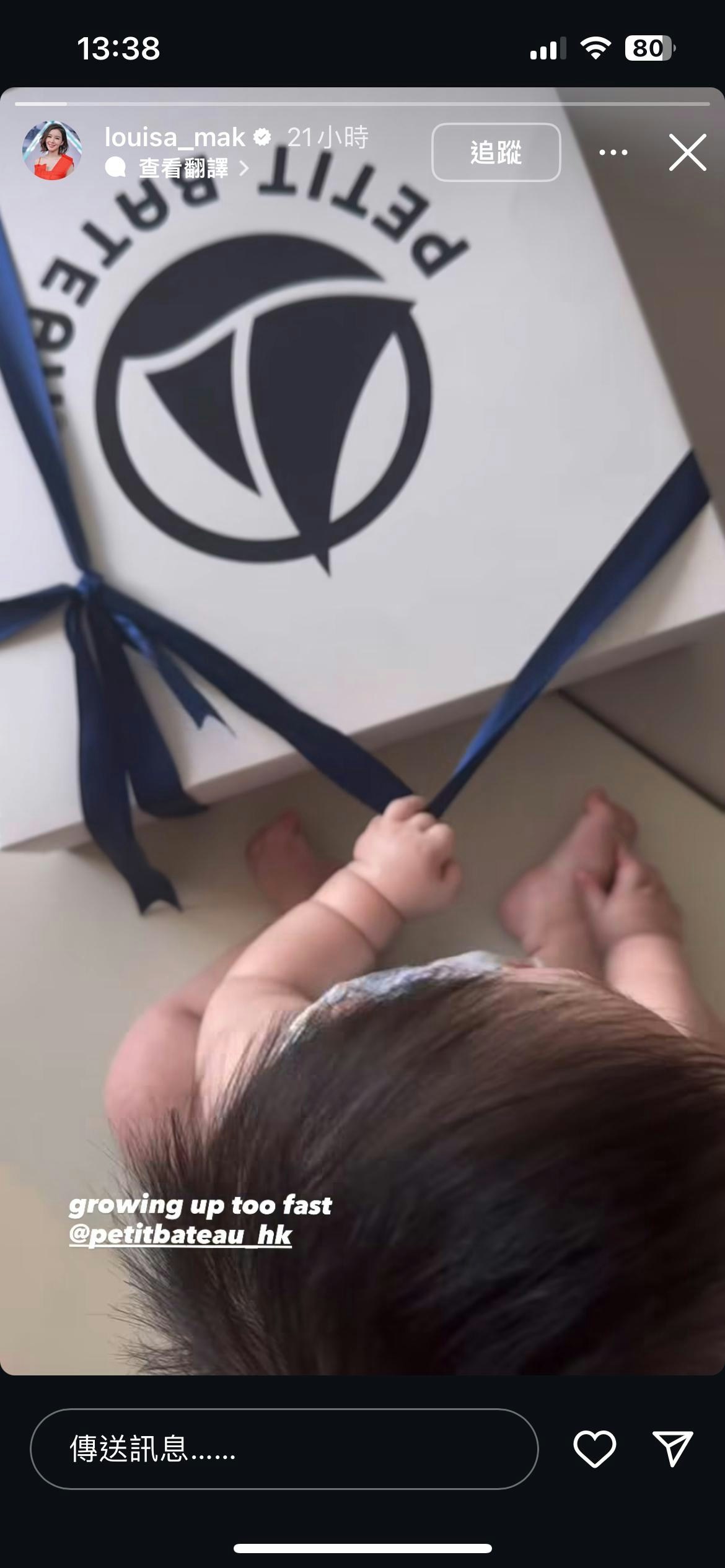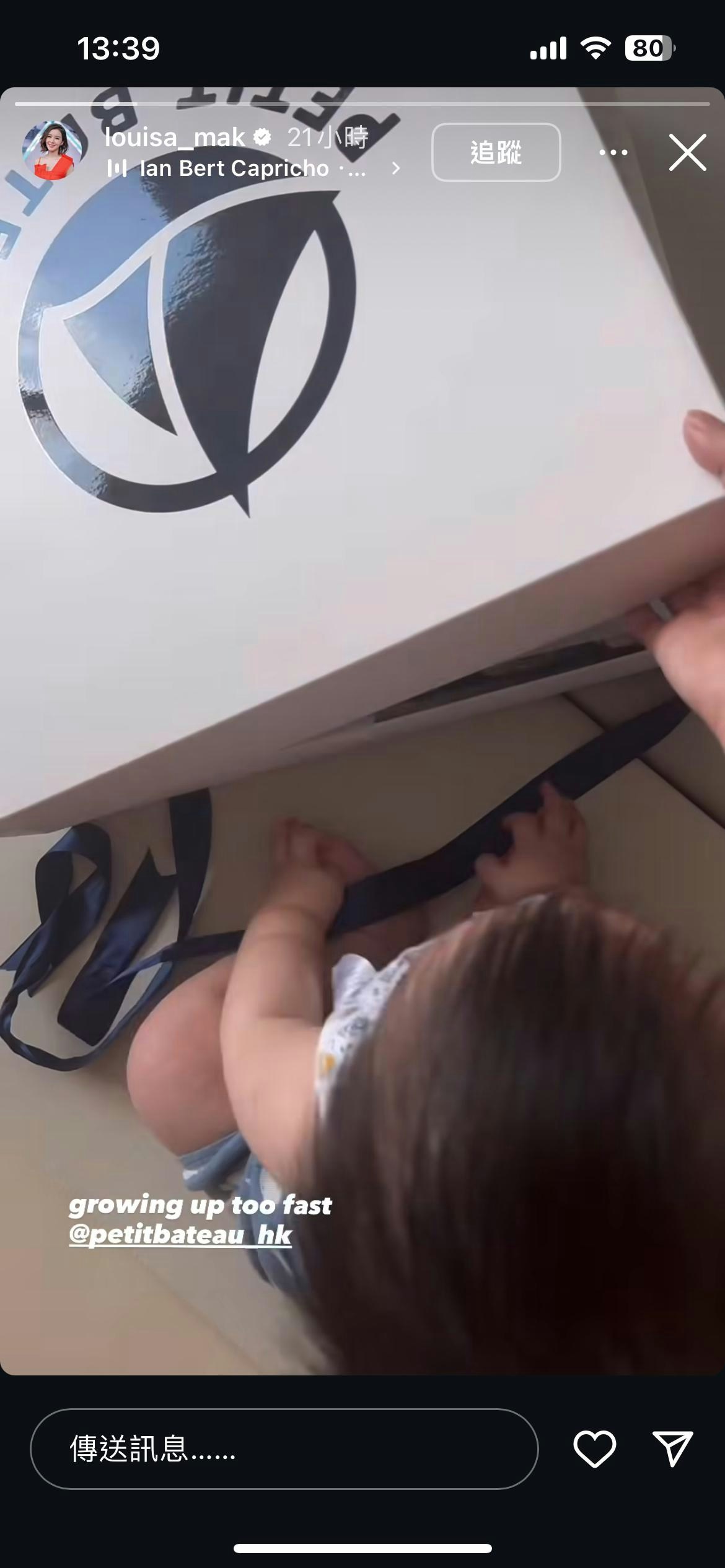 麥明詩的仔仔可以說是集萬千寵愛在一身,他還未出世時已獲大量品牌送贈禮物,嬰兒用品和bb衫等,而他出世後繼續不時會收到品牌送贈的禮物,可說是相當得寵。昨日麥明詩就於她的IG story分享了仔仔坐地上拆禮物的片段。從片中由上往下影的角度可見,她仔仔有好多頭髮,手仔腳仔都是肥嘟嘟一節節的,相當之肥美,就像那種一節節的長條型麵包,真是似十足米芝蓮般可愛。麥明詩仔仔看見一大盒禮物表現得十分興奮,也懂得用手去拆開,在他媽咪的協助下他總算拆禮物成功,解鎖了新技能,好叻叻。有網民就羨慕bb頭髮濃密。