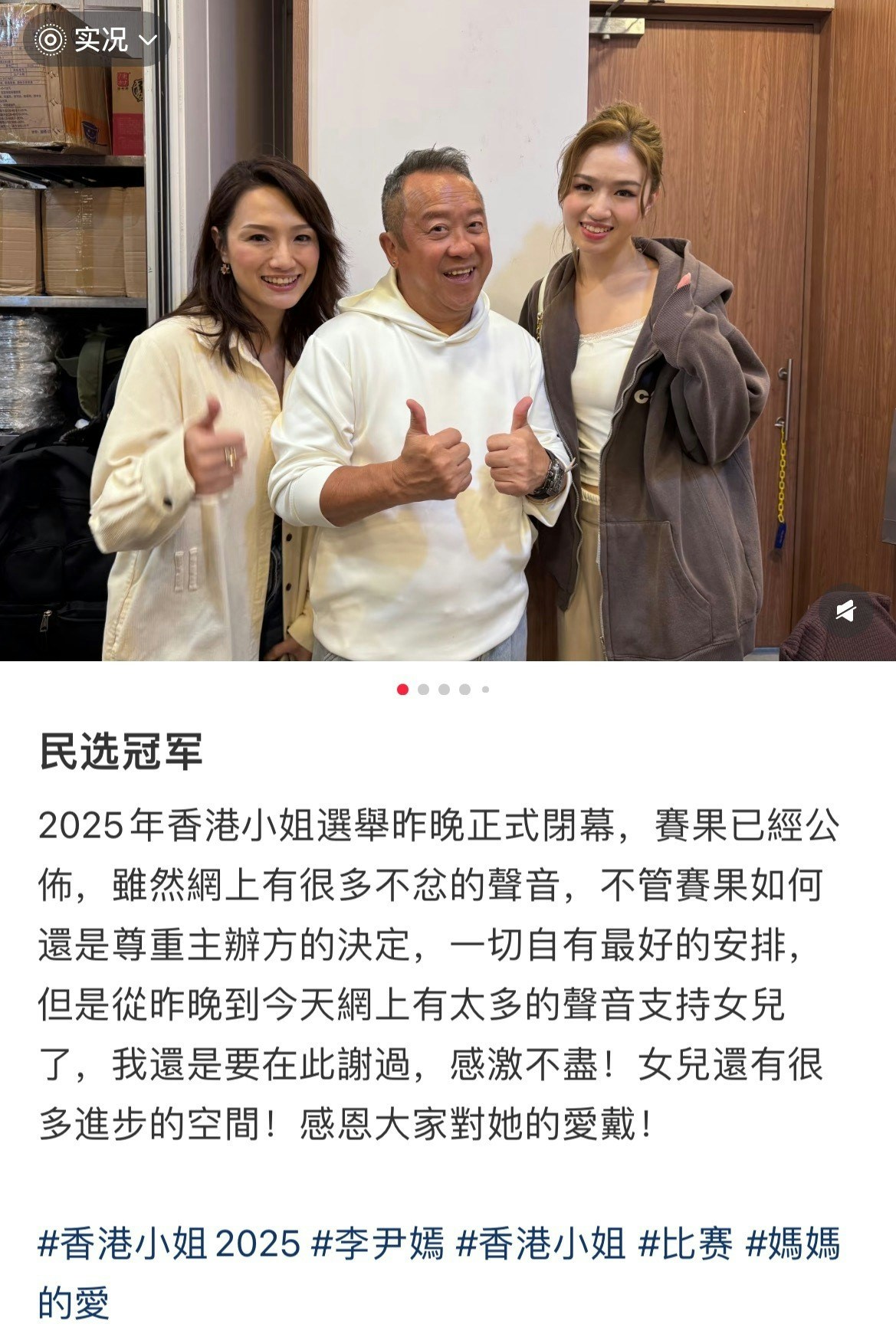 參選港姐以來,任職藝人經理的媽媽李安妮落力為女兒谷人氣,包括找圈中藝人好友發文力撐,又與女兒到紅磡觀音廟拜神兼供奉燈塔。對於賽果,媽媽李安妮於社交平台發文表示女兒係「民選冠軍」寫道:「民選冠軍,2025年香港小姐選舉昨晚正式閉幕,賽果已經公布,雖然網上有很多不忿的聲音,不管賽果如何還是尊重主辦方的決定,一切自有最好的安排,但是從昨晚到今天網上有太多的聲音支持女兒了,我還是要在此謝過,感激不盡!女兒還有很多進步的空間!感恩大家對她的愛戴!」不過網民對於李安妮的用詞反感,認為她不應該用「愛戴」形容,更指發文對女兒李尹嫣的支持度有反效果,事後,李安妮火速刪除該帖文。