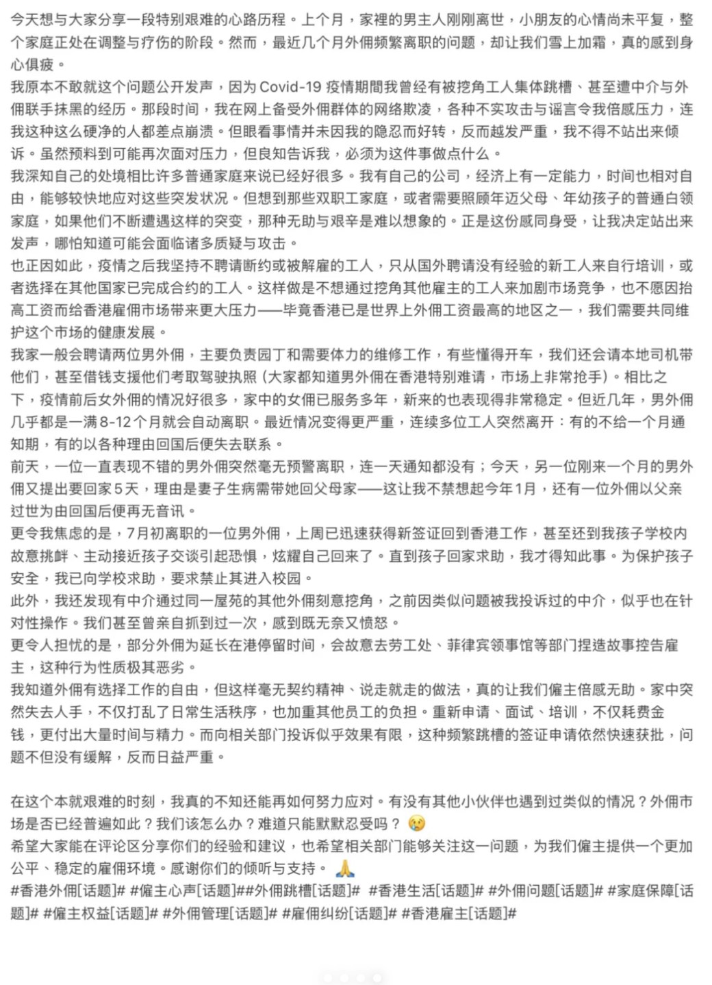 蔡一鳳說明撰長文目的,她指疫情期間外傭除了集體跳槽,更與中介聯手抹黑自己,「連我這種這麽硬凈的人都差點崩潰」,認為自己有責任站出來為其他香港僱主發聲。她提到近日又通上男外傭「毫無預警離職,連一天通知都沒有」,又或以不同理由離開失去音信,「今天,另一位剛來一個月的男外傭又提出要回家5天,理由是妻子生病需帶她回父母家—一這讓我不禁想起今年1月,還有一位外傭以父親過世為由回國後便再無音訊。」