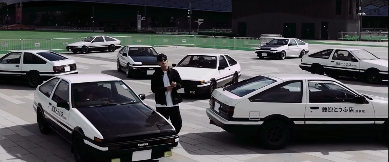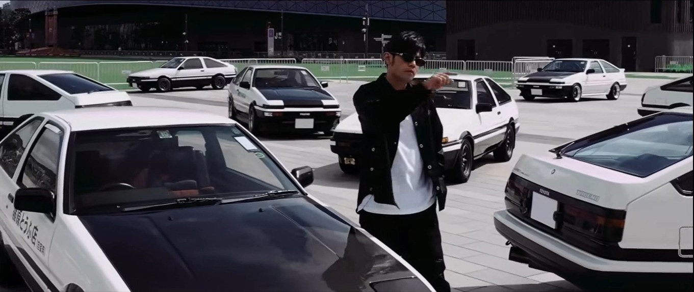 影片一來,只是AE86的車身,隨後看到一個貌似周杰倫的身影出現,雖然畫面一直朦朦朧朧,但都肯定是正貨,不是賣燒餅的「周餅倫」。而當周杰倫指頭在車頭上一彈,《頭文字D》主題曲《飄移》的音樂立即響起,周杰倫正面亮相。而鏡頭拉遠,更見到為數十架,主角拓海的專用車AE86,非常震撼。