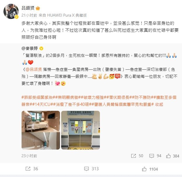 呂頌賢太太麥景婷透露兩個月來多次入院甚至ICU。(微博圖片)