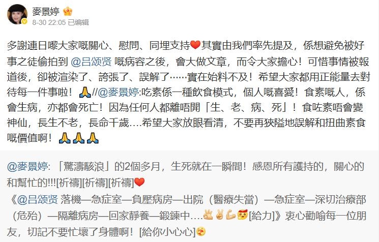 其實早前傳出病重消息後,已有人質疑是因為呂頌賢長期茹素所致,麥景婷曾回應:「多謝連日嚟大家嘅關心、慰問、同埋支持。其實由我們率先提及,係想避免被好事之徒偷拍到 @吕颂贤 嘅病容之後,會大做文章,而令大家擔心!可惜事情被報道後,卻被渲染了、誇張了、誤解了⋯⋯實在始料不及!希望大家都用正能量去對待每一件事🙏吃素係一種飲食模式,個人嘅喜愛!食素嘅人,係會生病,亦都會死亡!因為任何人都離唔開「生、老、病、死」!食咗素唔會變神仙,長生不老,長命千歲….希望大家放眼看清,不要再狹隘地誤解和扭曲素食嘅價值啊!🙏🙏🙏」
