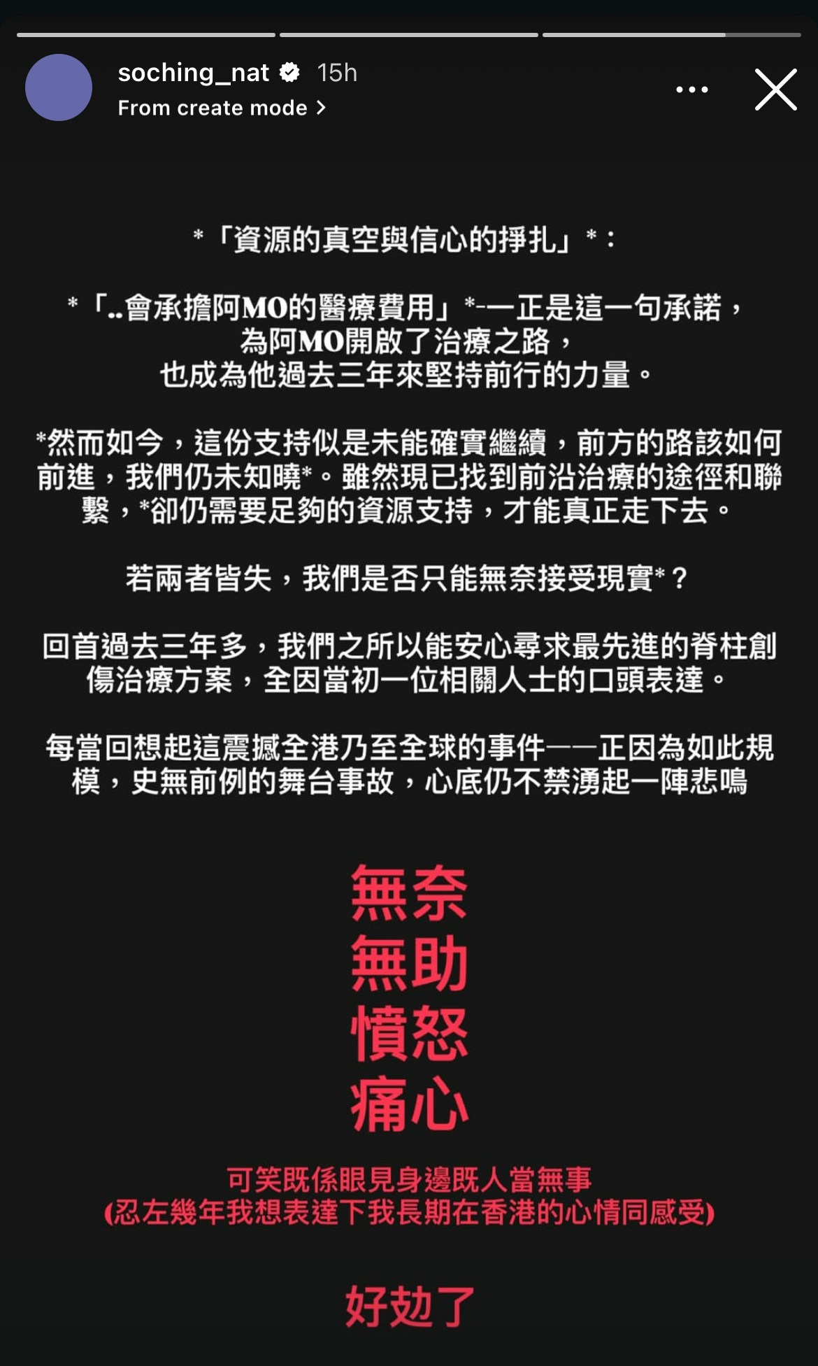 Mo父續說:「雖然現已找到前沿治療的途徑和聯繫,卻仍需要足夠的資源支持,才能真正走下去。若兩者皆失,我們是否只能無奈接受現實?回首過去三年多,我們之所以能安心尋求最先進的脊柱創傷治療方案,全因當初一位相關人士的口頭表達。每當回想起這震撼全港乃至全球的事件——正因為如此規模,史無前例的舞台事故,心底仍不禁湧起一陣悲鳴。」