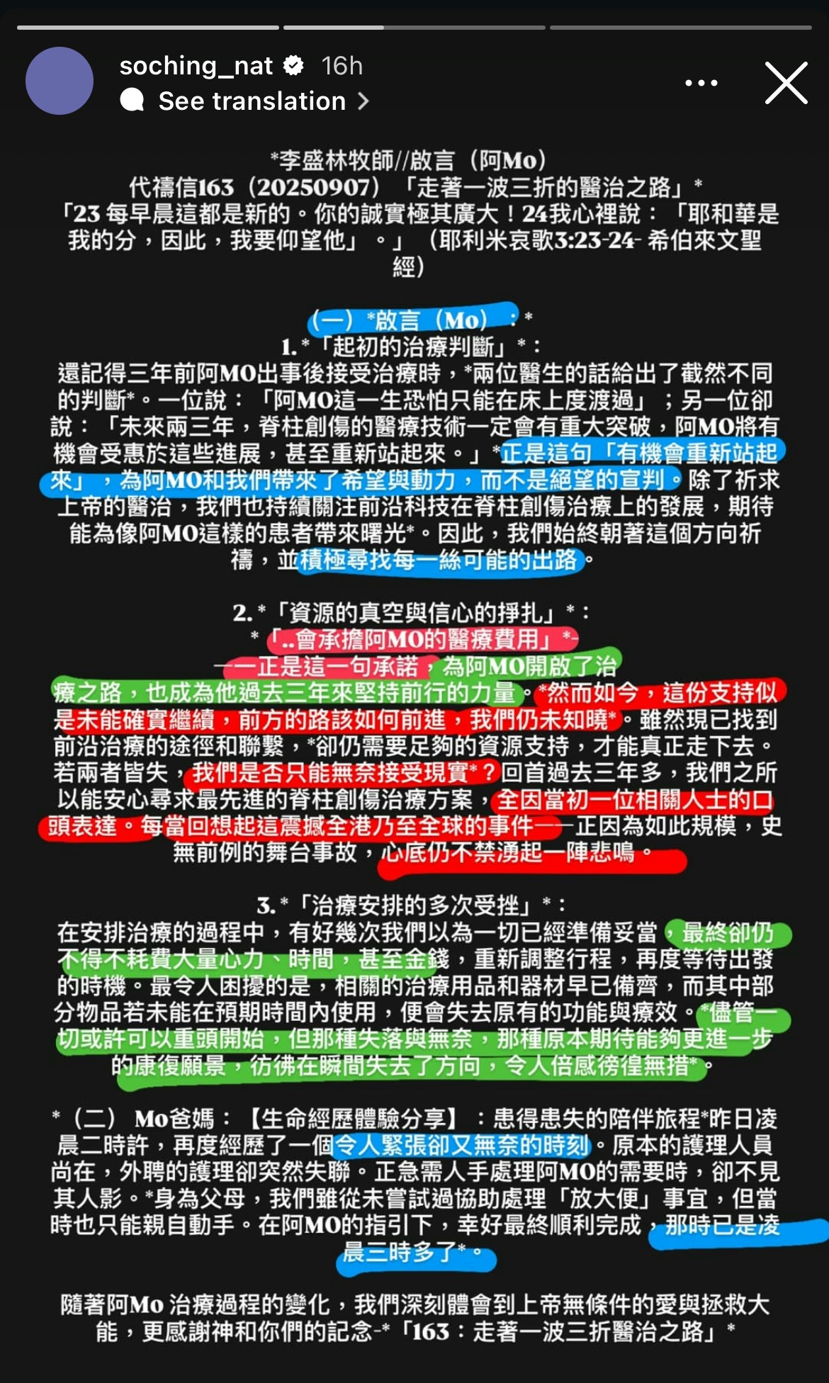 Mo父李盛林在最新代禱信中,批評有人似是未能確實繼續「會承擔阿MO的醫療費用」承諾。(IG@momo.lky)