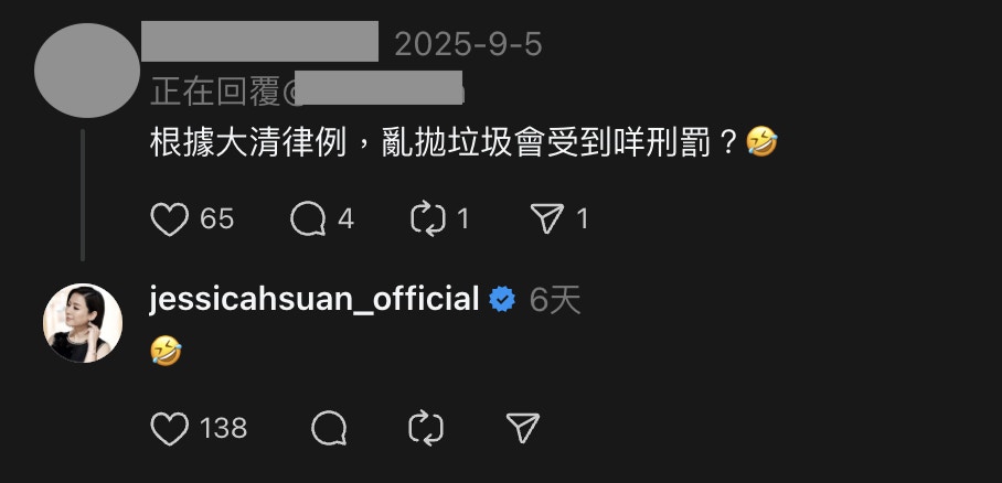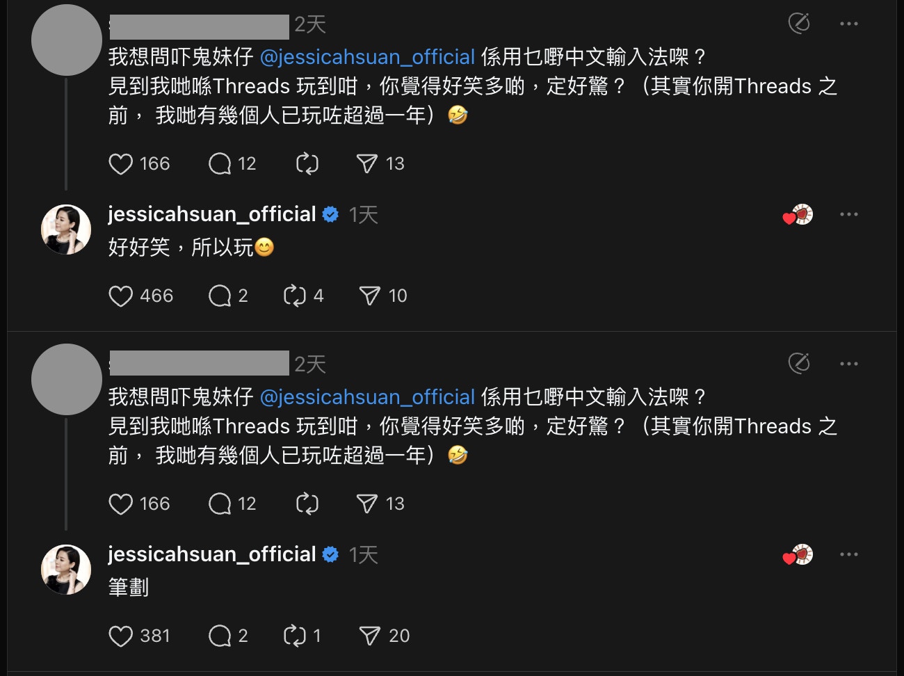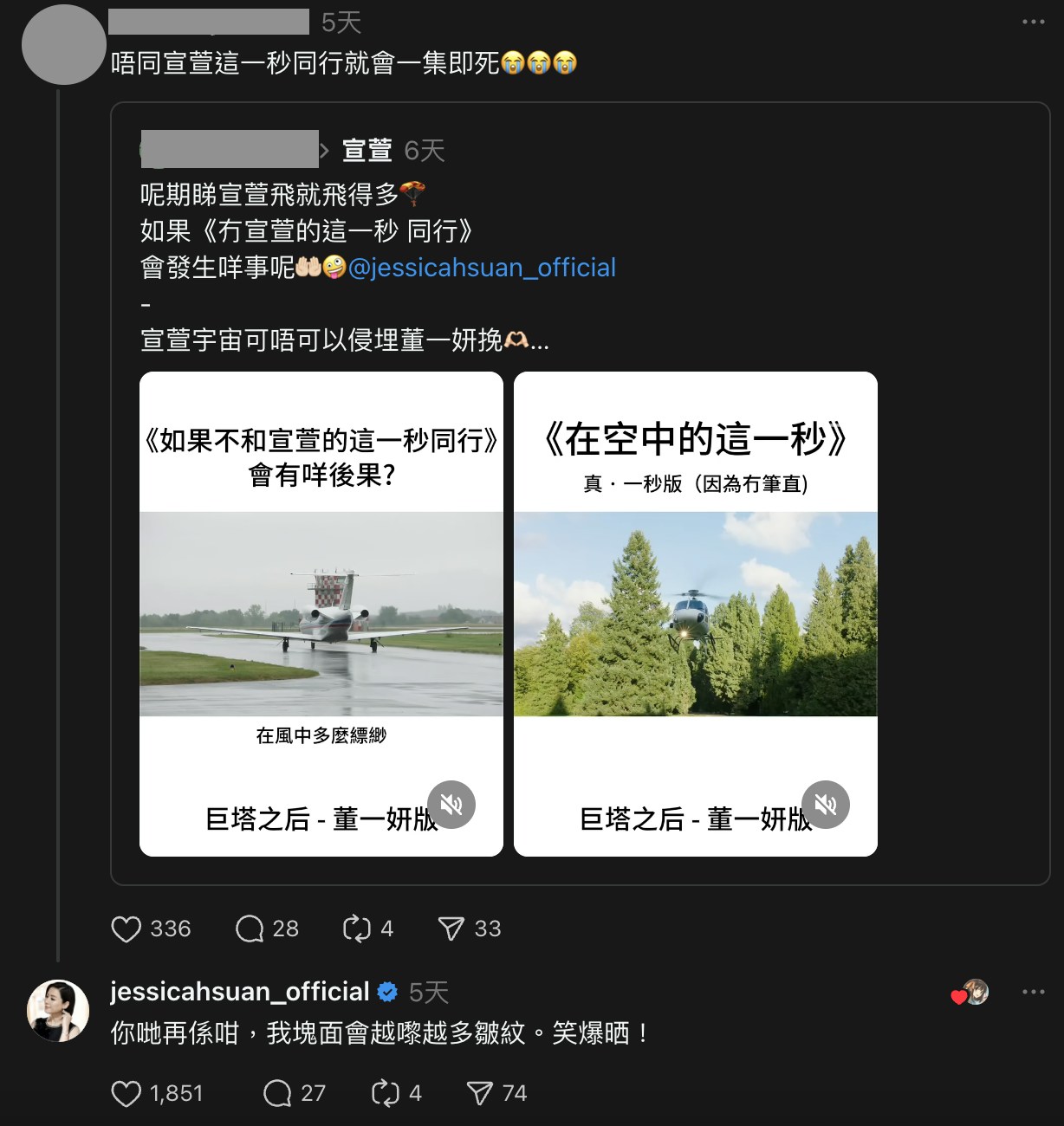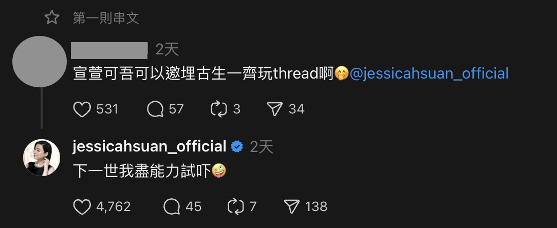 網民問宣萱幾時叫埋古天樂玩threads,宣萱:「下一世我盡能力試吓」。(threads@jessicahsuan_official)