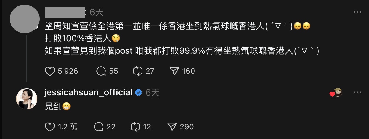 【宣萱/threads/熱氣球之亂/古天樂】做藝人真係唔容易!為了與fans交流,藝人除了更新Facebook之外,亦會玩Instagram、抖音、小紅書,和YouTube等等一系列社交平台。早前張家輝為宣傳新戲《贖夢》,在threads上開辦了「分身」蔡辛強(choi_san_keung),成功做了「脆友」打入後生仔圈子,亦非常成功地為電影造勢。早前熱氣球事件得到全城關注,宣萱因為早年《萬凰之王》中「坐」過熱氣球,更被網民做成meme圖變「香港坐熱氣球第一人」。