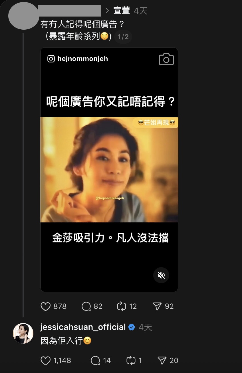 宣萱呢條片真係經典!背後仲有古天樂!。有網民話好欣賞佢敢言,宣萱回覆:「多謝公司當年冇雪我。」(threads@jessicahsuan_official)