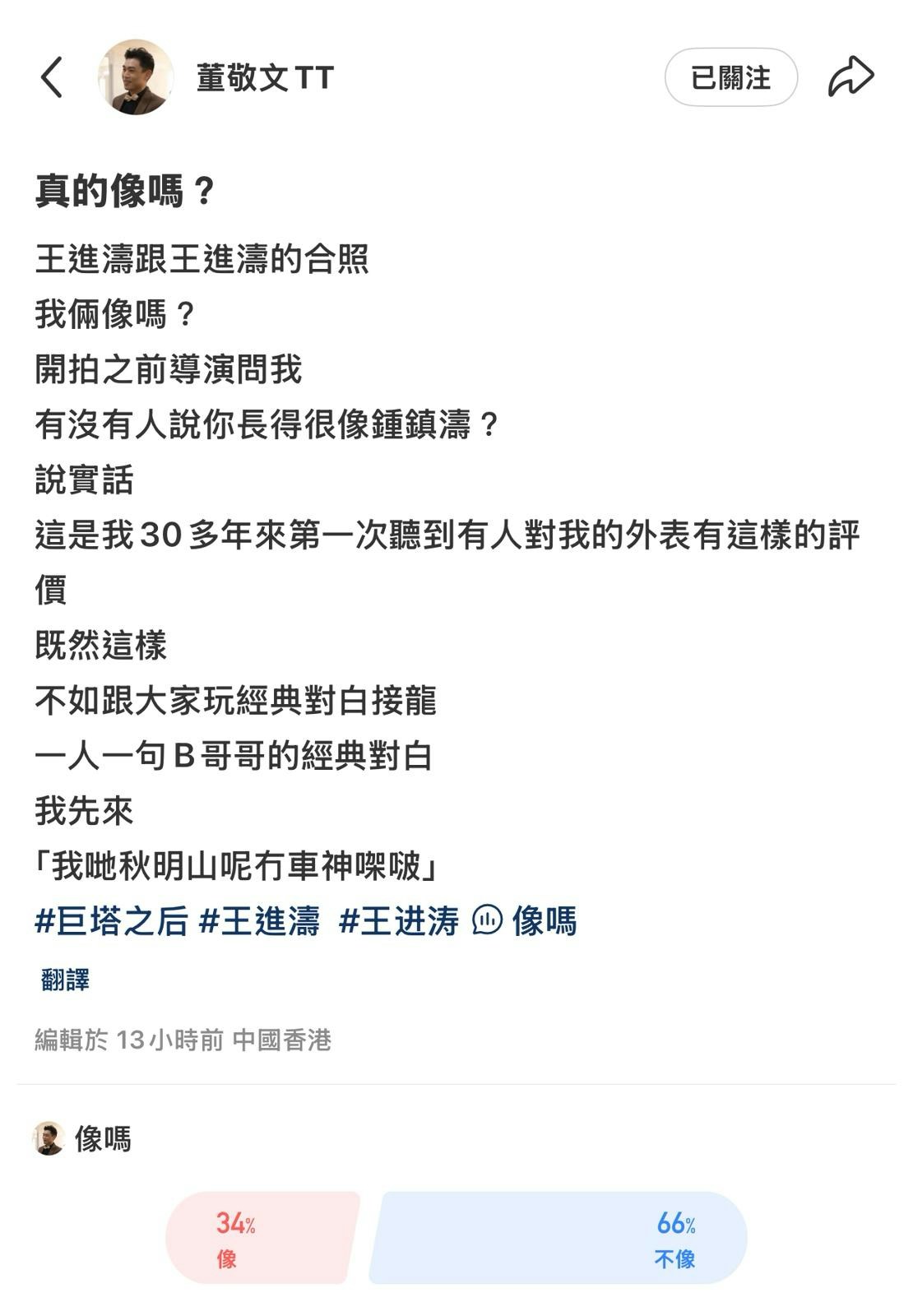 TVB新劇《巨塔之后》將於9月29日在香港播出,劇集除了有宣萱和陳展鵬這對新鮮組合坐陣外,另一個亮點莫過於鍾鎮濤相隔多年重返TVB拍劇,觀眾期待之餘,同劇後輩演員都興奮,劇中飾演鍾鎮濤年輕版的董敬文,也把握機會向這位大前輩集郵,並寫上:「我倆像嗎?開拍之前導演問我,有沒有人說你長得很像鍾鎮濤?說實話,這是我30多年來第一次聽到有人對我的外表有這樣的評價。」董敬文更搞鬼地發起經典對白接龍,向B哥哥致敬:「既然這樣,不如跟大家玩經典對白接龍,一人一句B哥哥的經典對白,我先來:我哋秋明山呢冇車神㗎啵」,引來不少網民互動。