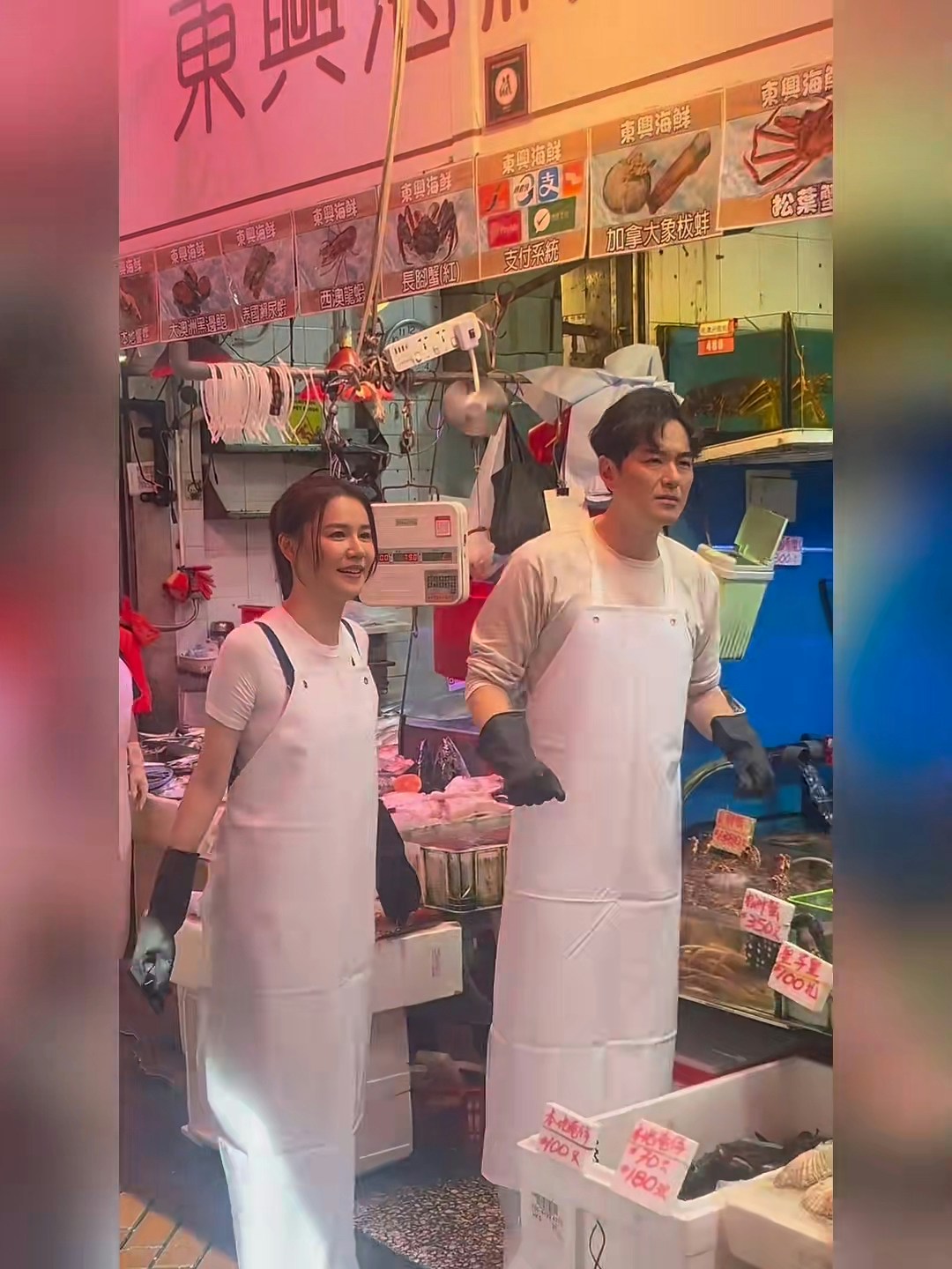 近日,有網民在社交平台分享,在銅鑼灣附近街市一間海鮮魚檔偶遇阿蕭兩公婆。從網上影片所見,阿蕭同翠如穿著圍裙,一身魚販裝束示人,全程笑容滿面,夫妻同心,默契十足。阿蕭負責處理海鮮,而身為富家千金的翠如,也沒有嫌棄街市濕滑污糟,一貫貼地在旁幫手兼熱情招呼客人。當有客人表示想買魚時,阿蕭還幽默指著翠如:「呢條吖!」搞笑之餘,十足十專業一樣,難怪會令人誤會他們是否轉行賣魚:「呢兩公婆咩事」、「賣魚夫妻檔」。