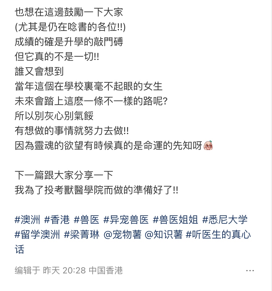 梁菁琳發文透露自己並非學霸,「從香港名校到澳洲獸醫 你心目中的準獸醫是怎麼樣的呢? 高中學霸? 全班第一?成績超好?抱歉,以上的形容詞全都不適用於我」。梁菁琳指:「中學時期的我真的不怎麽唸書 在學校裏的成績甚至跟亮眼一詞沾不上邊 每天放學以後就只顧着唱歌跳舞 (是的我甚至考慮過報讀演藝學院)」。她指考入名校只是「意外」,並鼓勵大家「成績的確是升學的敲門磗 但它真的不是一切!!」