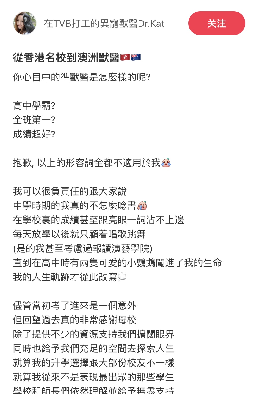 31歲「東張女神」梁菁琳(Katerina)曾參選港姐,曾以「盜墓者羅拉」造型採訪突顯驕人身材,吸引網民目光。梁菁琳除了身材姣好,背景亦相當猛料,她以雙重一級榮譽於世界排名前50的名牌學府澳洲悉尼大學畢業,主力研究動物胃部真菌感染等科目,參選港姐前任職獸醫,參選期間一度被封為「學霸港姐。」近來梁菁琳以「在TVB打工的異寵獸醫Dr.Kat」在內地小紅書與網民互動,並發文自言並非學霸,並曬出清純學生照,但竟然被指是靠父幹!