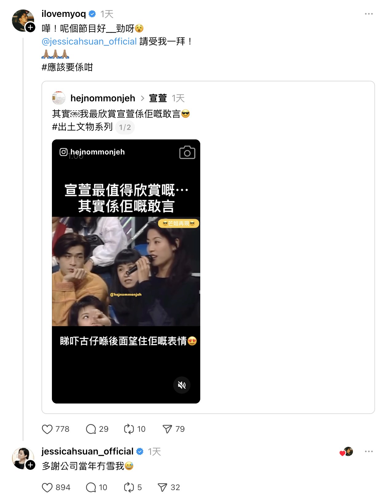 而ViuTV台柱強尼都有轉貼片段,留言:「嘩!呢個節目好__勁呀😵,請受我一拜! 🙏🏽🙏🏽🙏🏽 #應該要係咁」 宣萱都有再親自回覆:「多謝公司當年冇雪我😅」