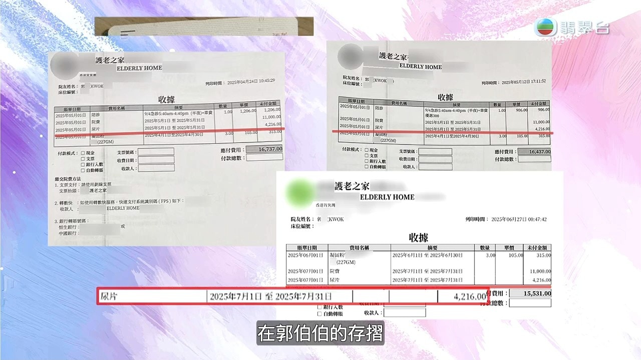 鄰居一家打算取回郭伯伯的身分證替他辦理身後事,但老人院方面卻扣起郭伯伯身分證。老人院向他們一家表示,郭伯伯有未付清的款項,要求他們付清後才可取回身分證。據老人院方面提供的單據,列明多個費用,合共約四萬多。