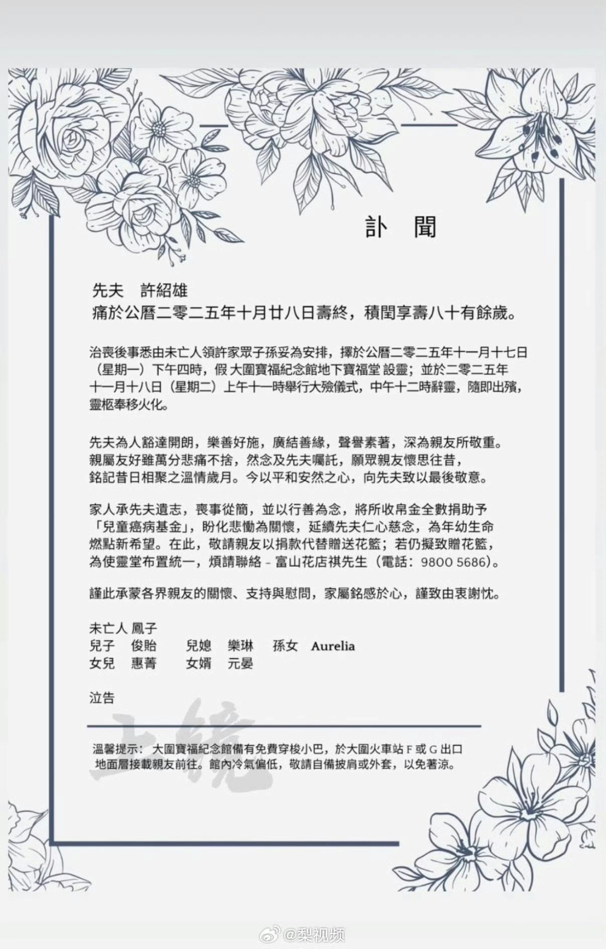 先夫 許紹雄 痛於公曆二零二五年十月廿八日壽終,積閏享壽八十有餘歲。