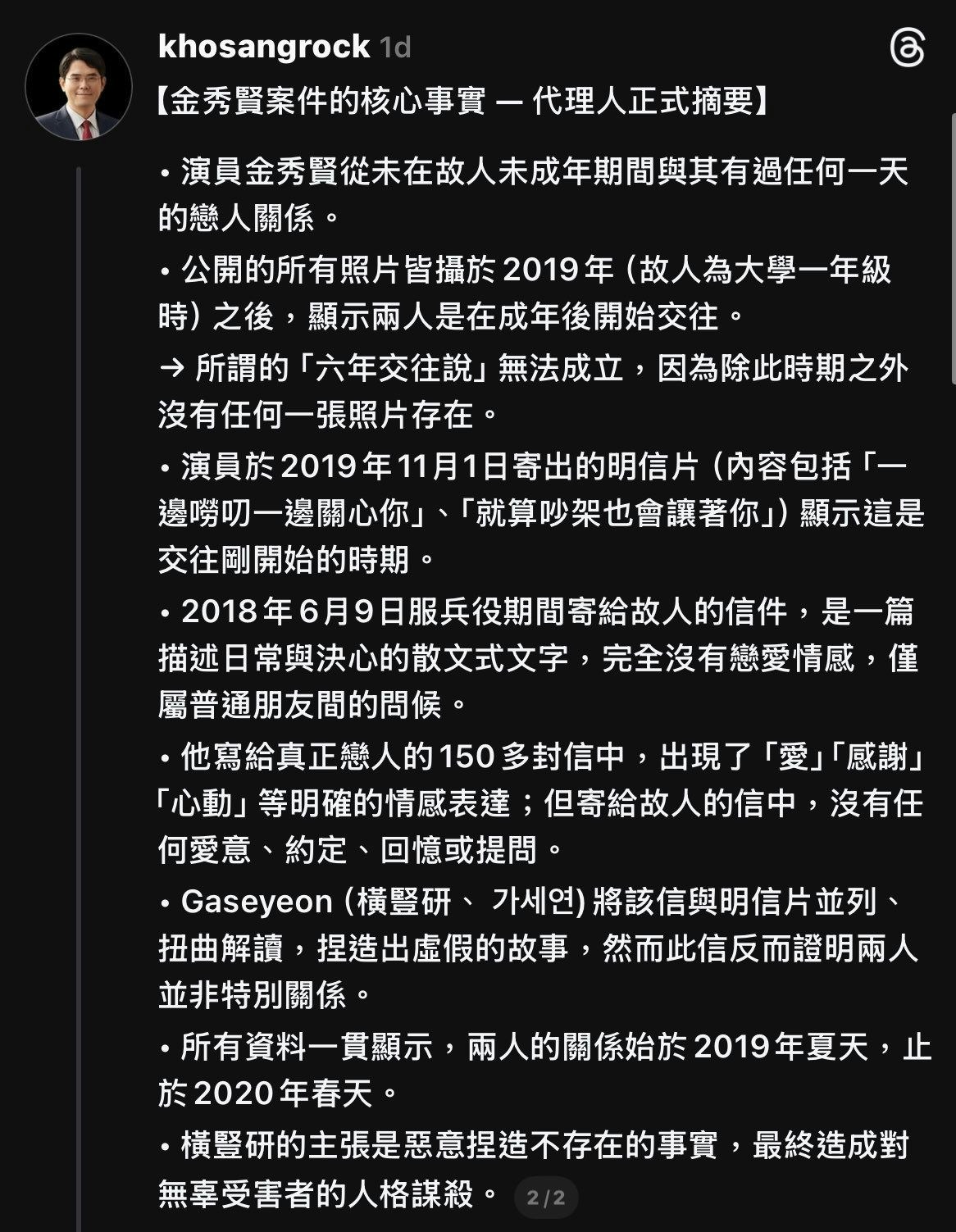 然而,YouTube頻道「橫豎研究所」卻將該封軍中信件與明信片並置比對,並加以扭曲解釋,藉此建構出不實的敘事與戀情情節。代理人指出,所有資料與時間軸均清楚顯示,兩人僅於2019年夏季至2020年春季短暫交往,除此之外並無其他情感交集。因此橫豎研究所的相關主張,完全建立於虛構與惡意捏造之上,其行為已構成對金秀賢人格的嚴重侵害與毀損。