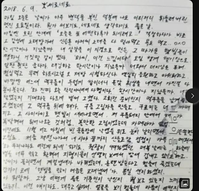 律師表示金秀賢在服兵役期間寄出的一封信件,內容僅描述日常生活與個人勉勵,採用散文筆法。(Instagram@soohyun_k216)