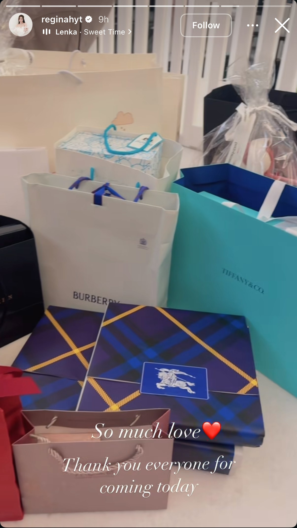被問為什麼不是「百日宴」而是「180日宴」,何依婷就向傳媒解釋,因為BB 100日時她剛好出埠工作兩星期,與老公商討後決定改為半歲時補祝。(IG圖片) 而「180日宴」布置以粉紅色為主,現場有粉紅色花、氣球等等,何依婷透露自己今次約邀請了100位朋友,之後她貼出一段禮物片段,只見有數不盡的名牌紙袋,如FENDI、Dior、BURBERRY、Tiffany & Co.等等,相信是朋友送給BB的禮物,何依婷就表示:「So much love Thank you everyone for coming today(很多愛,感謝今日到來的每個人)」