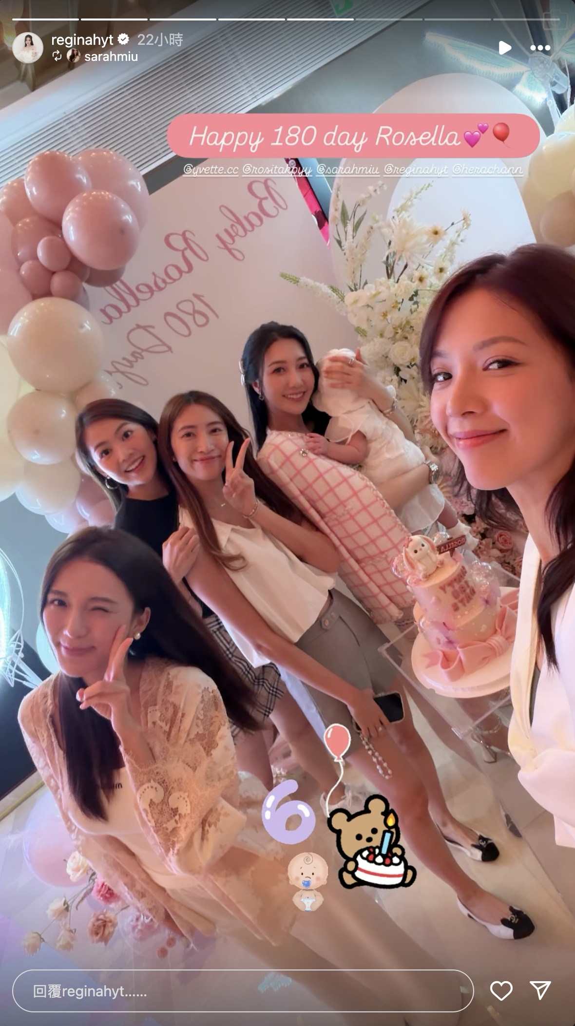 何依婷今年4月成為人母,誕下愛女Rosella,日前她與老公就為囡囡舉行「180日宴」,獲不少圈中好友到賀,例如陳曉華、郭柏妍、陳星妤、陳懿德、陳詩欣、蔡嘉欣、鍾晴等等,不過很多人都好奇,為什麼不是「百日宴」而是「180日宴」,何依婷就向傳媒解釋,因為BB 100日時她剛好出埠工作兩星期,與老公商討後決定改為半歲時補祝。何依婷在今年4月誕下女兒Rosella。(IG@reginahyt)