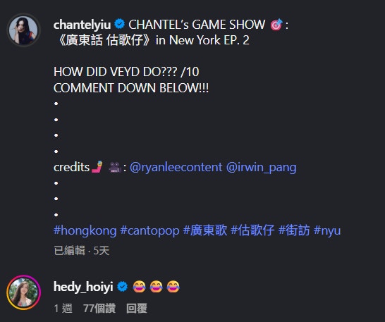 Chantel特別標記Ryan嘅IG賬號,原來由佢幫忙拍攝。(IG@chantelyiu)
