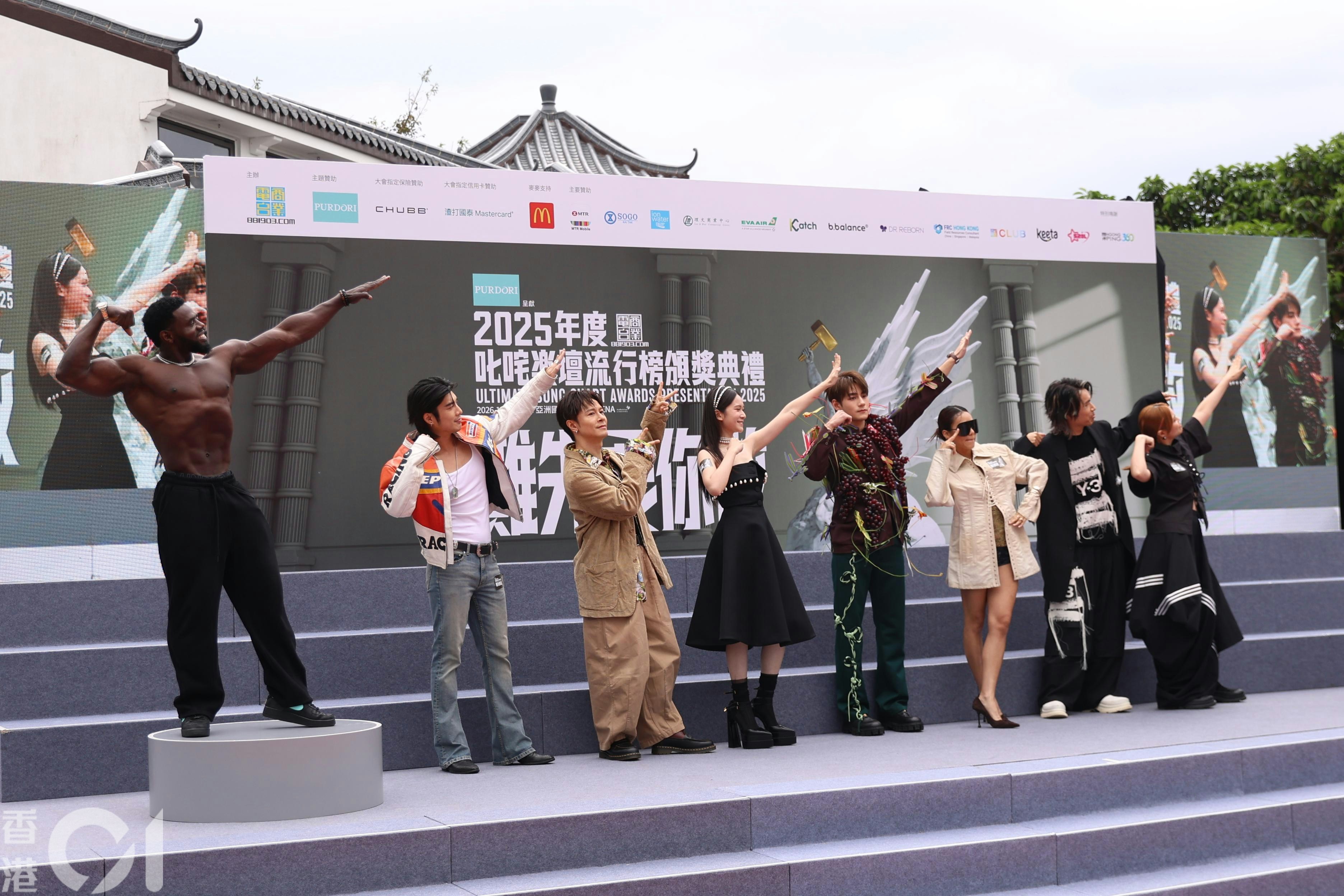 雲浩影(右五)跟大隻佬MC一齊擺甫士。(陳順禎攝)