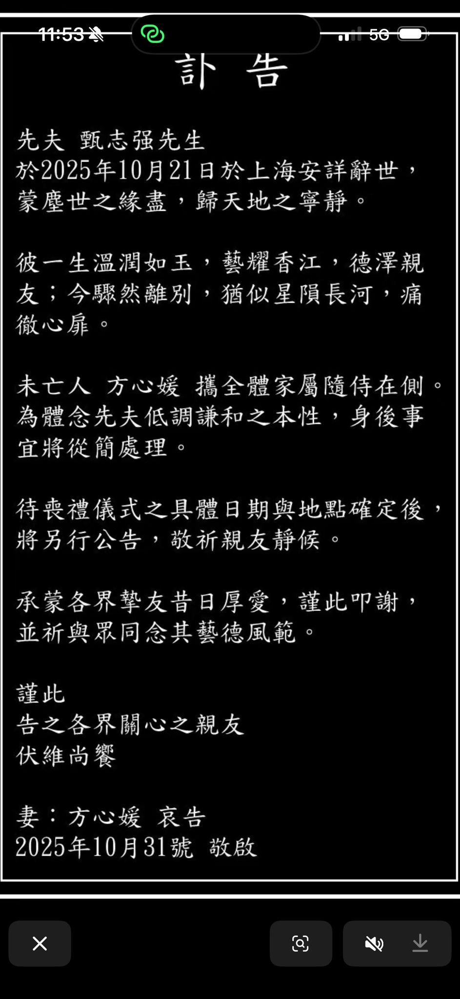 前亞視小生甄志強,曾演出劇集《碧血青天楊家將》,被封為「最帥展昭」,只是發展平平,最讓人印象深刻,他近年更回歸幕前,客串《詭探》及《PTU機動部隊》,不過他的太太突然發出訃告指:「先夫 甄志强先生 於2025年10月21日於上海安詳辭世。」
