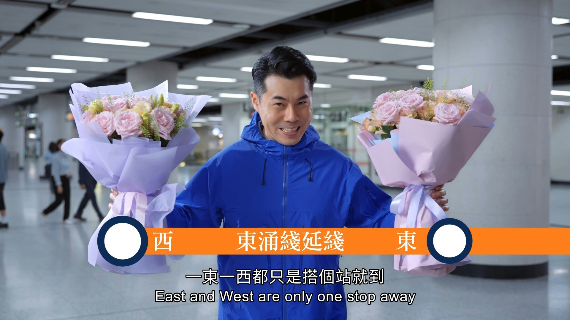 港鐵全新廣告短片《尋.未來記》裏面,由林峯飾演嘅「寡人」手持太傅留下嘅穿越時光機器,由秦代穿越到現代港鐵網絡!今日登場嘅第二集,「寡人」去到未來,遇到多年前被新聞採訪後變成網絡紅人嘅「情人節花先生」。當年喺花墟手持兩紥花並拜託記者唔好串煲嘅佢,喺未來時竟然再度手持兩紥鮮花。喺「寡人」查問下,「花先生」仍然好似多年前咁閃縮,但終於鼓起勇氣講明鮮花絕對唔係為東宮西宮唔同情人去買!原來兩紥花其中一紥係買畀喺東涌東站同住嘅老婆,另一紥就係幫住喺東涌西站逸東邨嘅兒子買,依家正係做緊「廿四孝老豆」,搭東涌延綫送花。「寡人」為各大觀眾揭曉「花先生」竟然唔係花心男而係「廿四孝老豆」,更預覽未來東涌綫延綫成為區內主要連接東西社區嘅公共運輸交通,大大拉近不同社區生活嘅家庭成員關係。「寡人」大為感動之時,耳邊突然響起熟悉聲音,高呼「管家佬」!
