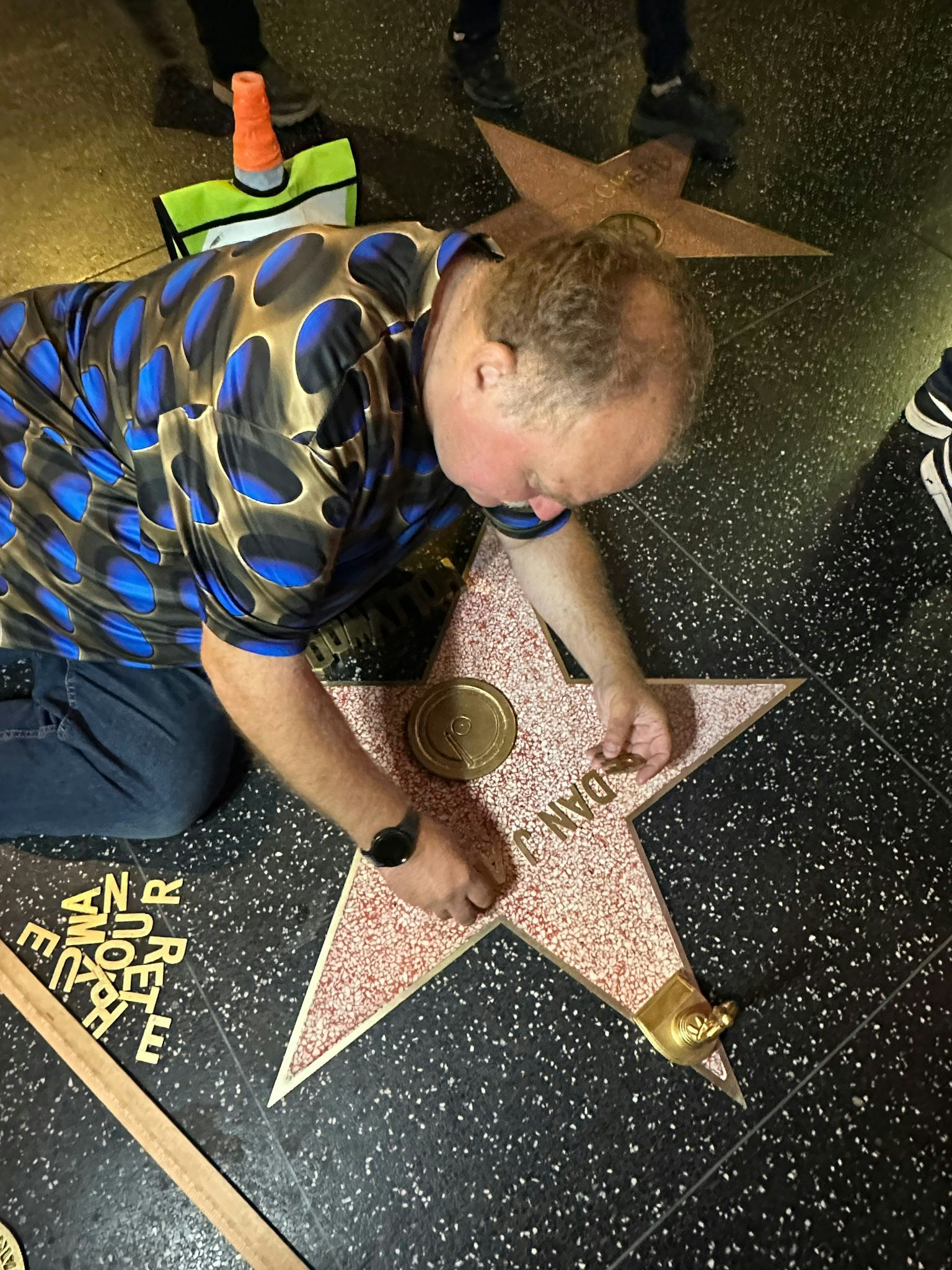 不過,細心一看就會發現,那個鑲有他的名字的名牌與旁邊的名牌略有不同⋯⋯Dan James(丁丁)接受《香港01》訪問時,坦言最近與Eric Kwok郭偉亮組成限定組合Ho Ho One好好運到美國洛杉磯潑水節表演,經過星光大道旅遊時「順便」留下了名字:「興奮到難以形容!好開心成功留下名字,這對我意義十分重大!我希望以後也能留下掌印!將來可以帶住我嘅Fans真真正正係星光大道摘星。」之後,他更大爆如何才能在星光大道「摘星」:「這張照片是真的!並不是用AI合成,但這只是一個給遊客體驗的活動,只需要付出$20美金,就有專人製作一個名牌讓你拍照留念,哈哈哈。」