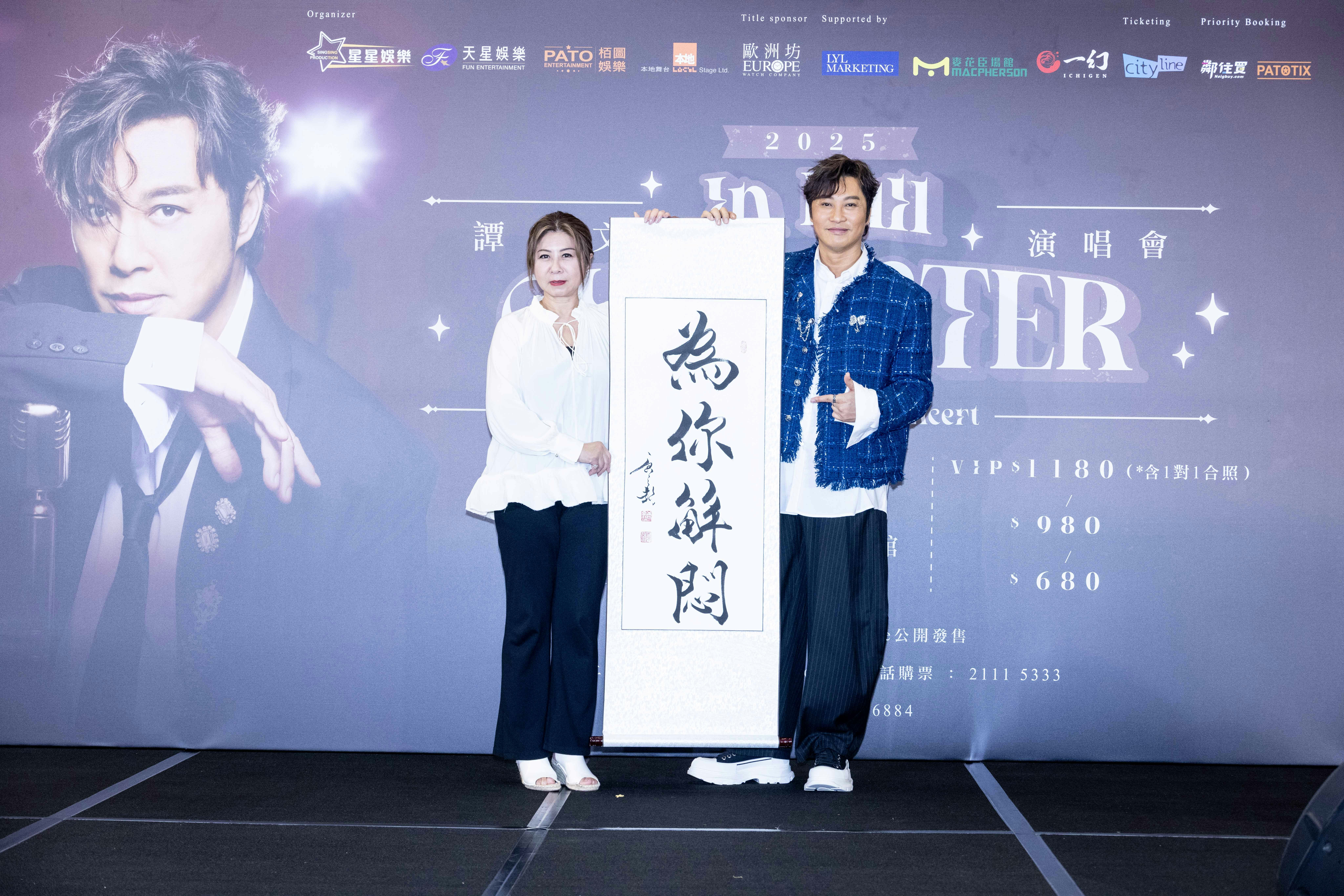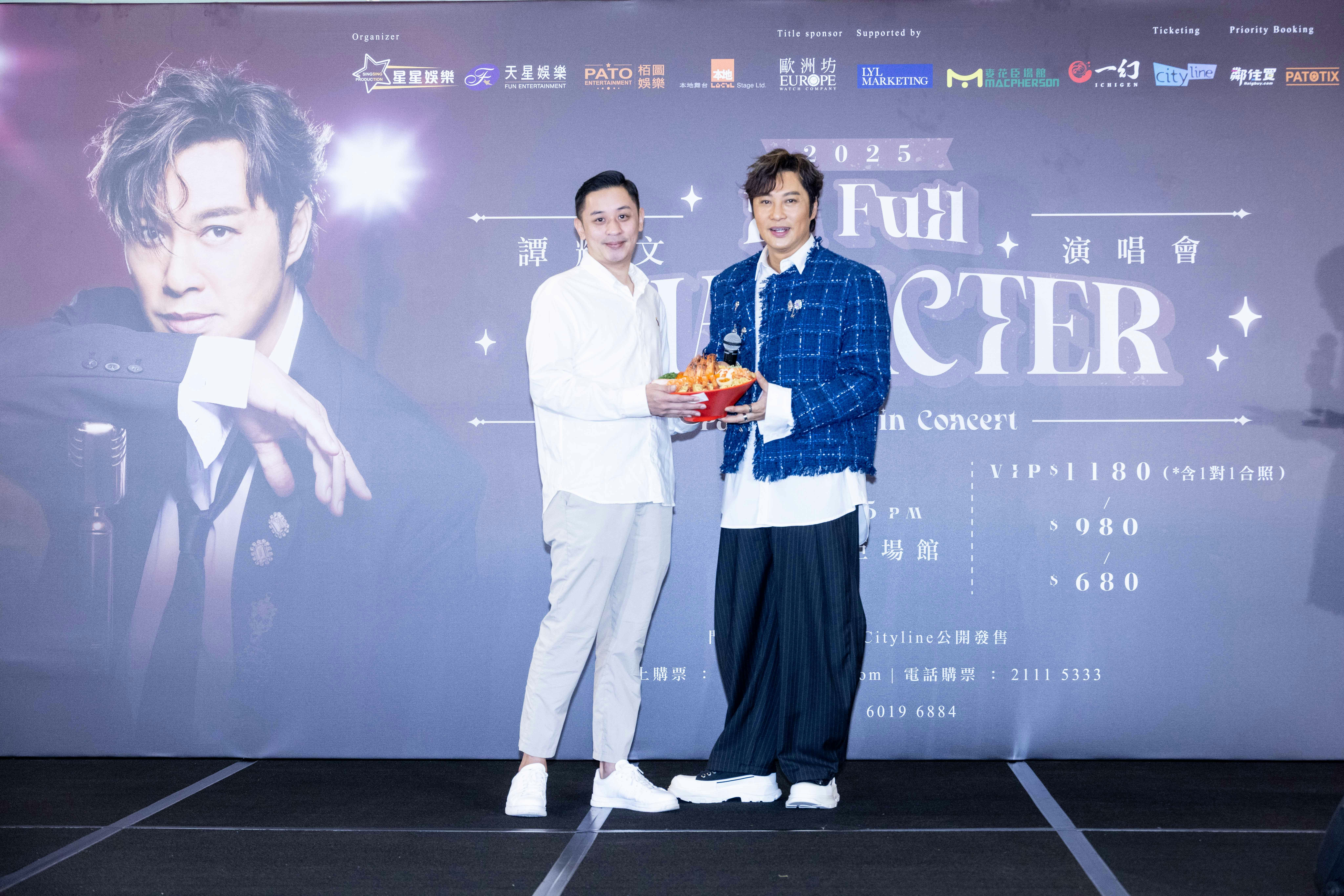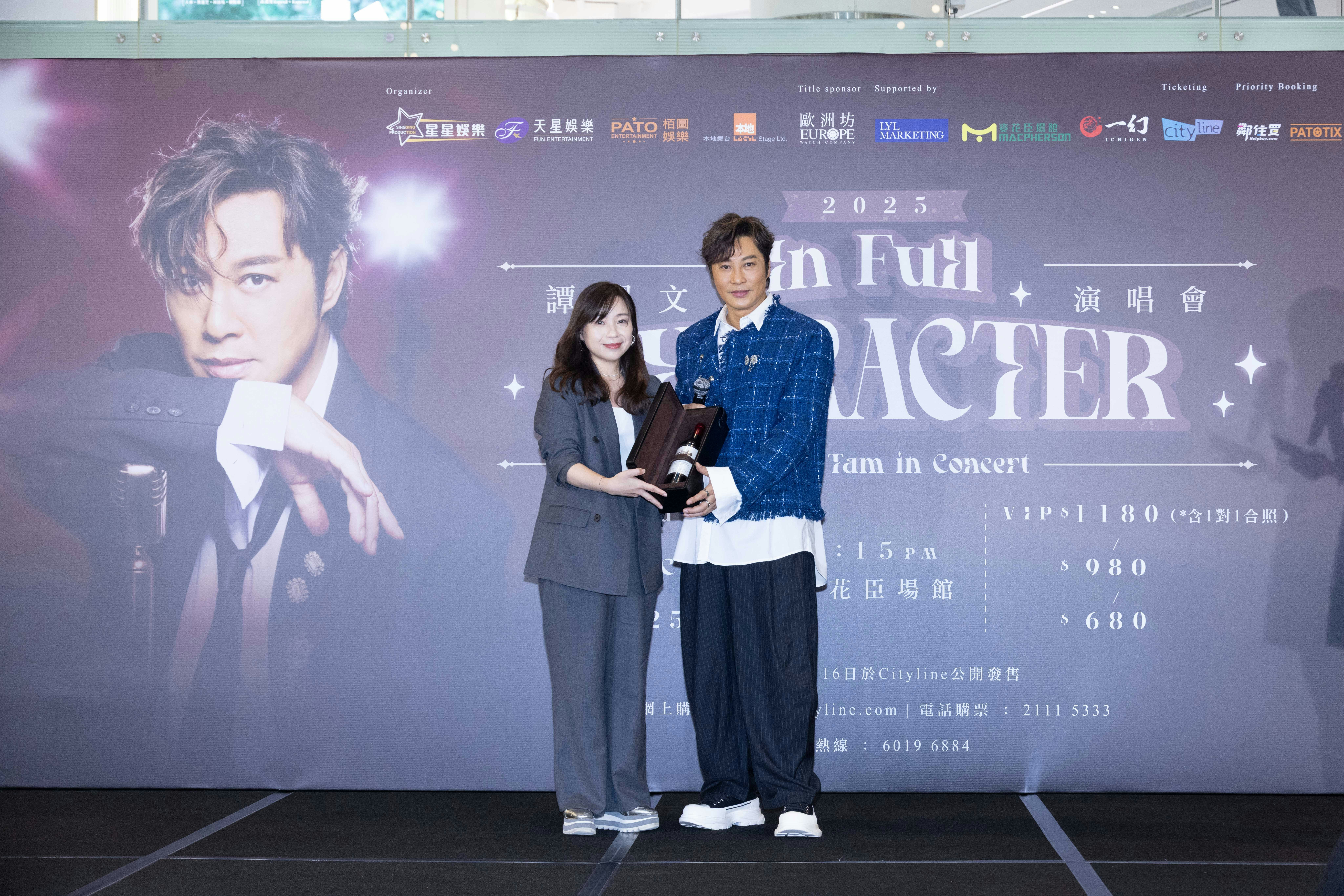 主辦單位天星娛樂陳淑芬陳太帶來一份很有意義的禮物,陳太說:「我和阿譚結縁於風雲音樂劇,在劇中阿譚飾演無名這位世外高人,我特別把他在劇中所穿戴的這對手腕護甲送給他,去年我在澳門舉辦的50周年紀念展中,也曾在現場展覽這對護甲。我和阿譚合作時他真的很勤力,很佩服他的堅持和努力,加油。」另一主辦單位星星娛樂則送上以譚耀文首張專輯名稱「為你解悶」這四字寫成書法字畫送給他,別具心思。最後阿譚、主辦單位和贊助商進行簡單而隆重的祝酒儀式,祝願演唱會門票大賣。