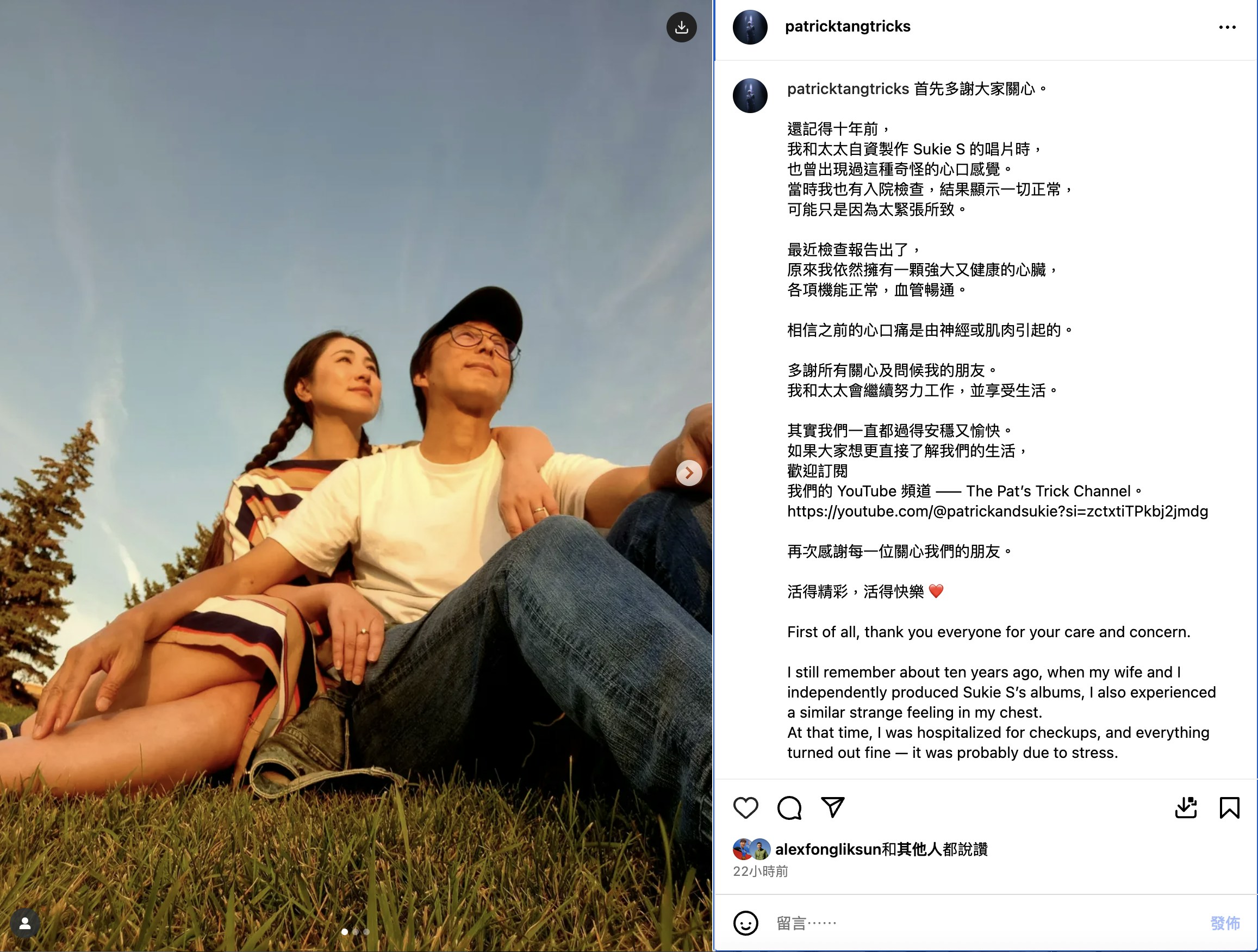 鄧健泓在IG發文表示:「首先多謝大家關心。還記得十年前,我和太太自資製作 Sukie S 的唱片時,也曾出現過這種奇怪的心口感覺。當時我也有入院檢查,結果顯示一切正常,可能只是因為太緊張所致。最近檢查報告出了,原來我依然擁有一顆強大又健康的心臟,各項機能正常,血管暢通。相信之前的心口痛是由神經或肌肉引起的。多謝所有關心及問候我的朋友。我和太太會繼續努力工作,並享受生活。其實我們一直都過得安穩又愉快。」