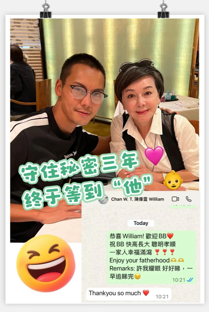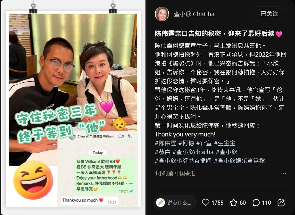 查小欣在陳偉霆官宣生B後,隨即在小紅書爆內幕,透露早在2022年陳偉霆回港拍攝電影《爆裂點》時,曾私下向她透露戀情:「小欣姐,告訴你一個秘密,我在跟何穗拍拖,為好好保護這段戀情,暫時要保密。」查小欣指自己保守這個秘密長達三年,今終傳來喜訊。她還估計BB性別:「他官宣寫『爸爸、媽媽,還有他』,是『他』不是『她』,估計是個男寶寶。陳偉霆非常孝順,陳媽媽抱孫了,定開心得笑不攏嘴。」查小欣亦第一時間發訊息恭喜,陳偉霆亦秒速回應:「Thank you very much!」