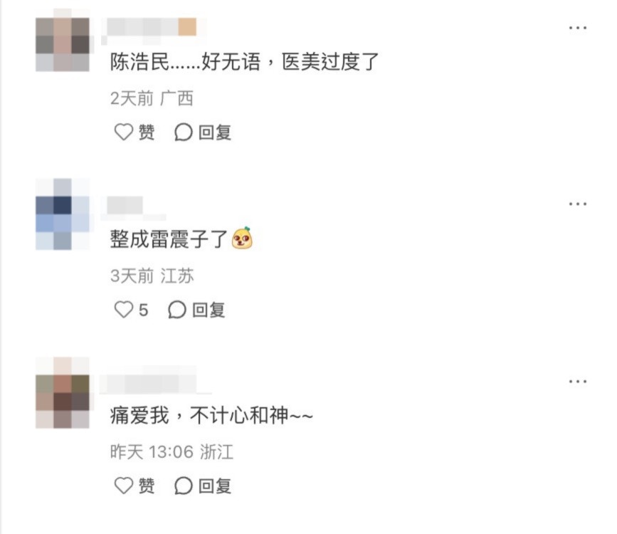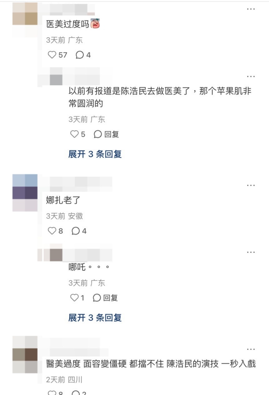 不少網民都驚訝陳浩民容貌變化很大:「發泡臉嚴重的很」、「醫美過度嗎?」、「蘋果肌非常圓潤的」、「面容變僵硬」、「哪吒老了」、「變成雷震子了」、「我就覺得很生硬了」、「打美顏針??」。