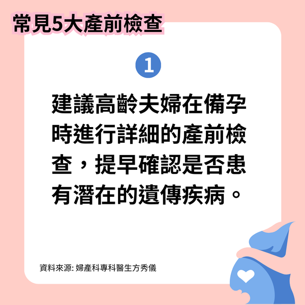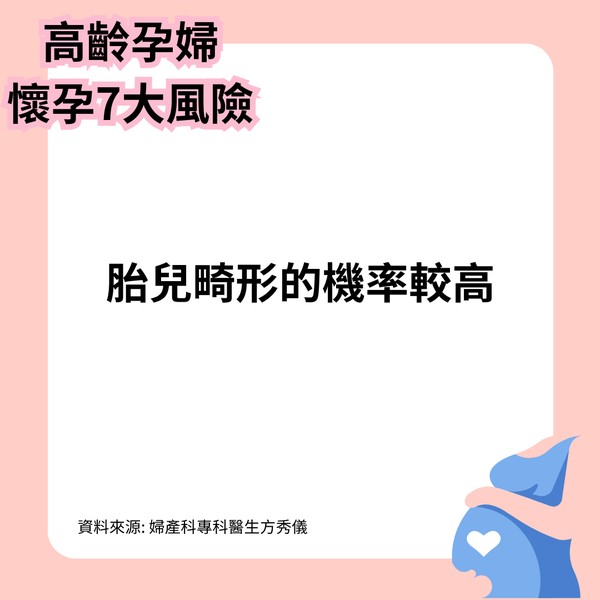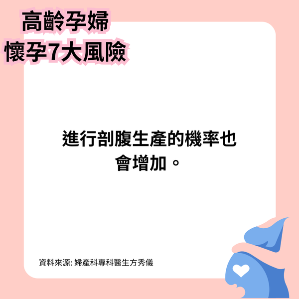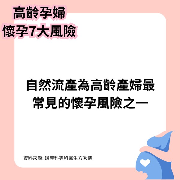 方秀儀表示,高齡孕婦會有較高流產風險,風險約於30歲後遞增。35歲孕婦流產機率約為20%,40歲孕婦流產機率約為40%,45歲孕婦流產機率增至80%。因此,她建議高齡夫婦在備孕前最好作詳細的產前檢查。