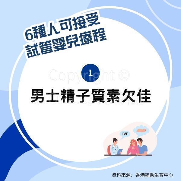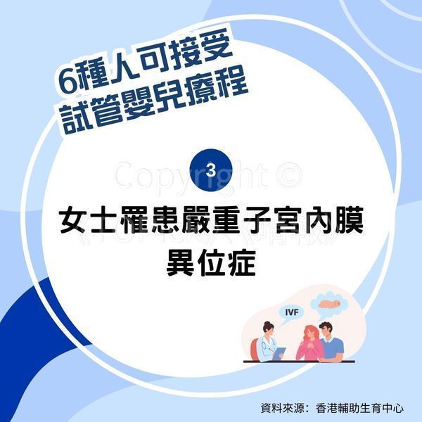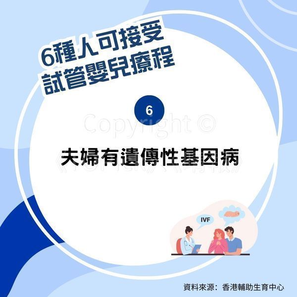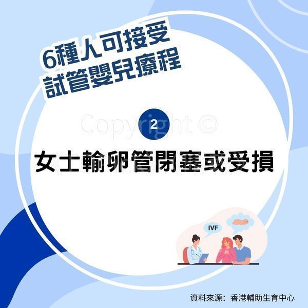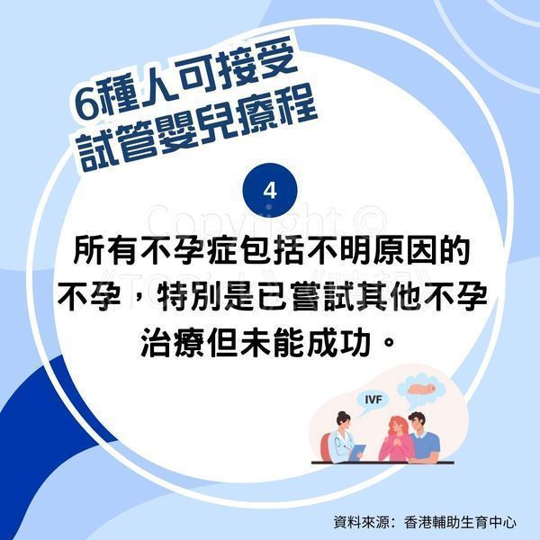根據仁安生殖醫學中心的參考數據,在香港大約每6對夫婦,便有一對要面對不育煩惱,如夫婦有意找香港私家醫院或診所進行生育治療,每個體外受孕或稱試管嬰兒療程費用,介乎由8萬元至15萬元之間。而有6種人可接受試管嬰兒療程: