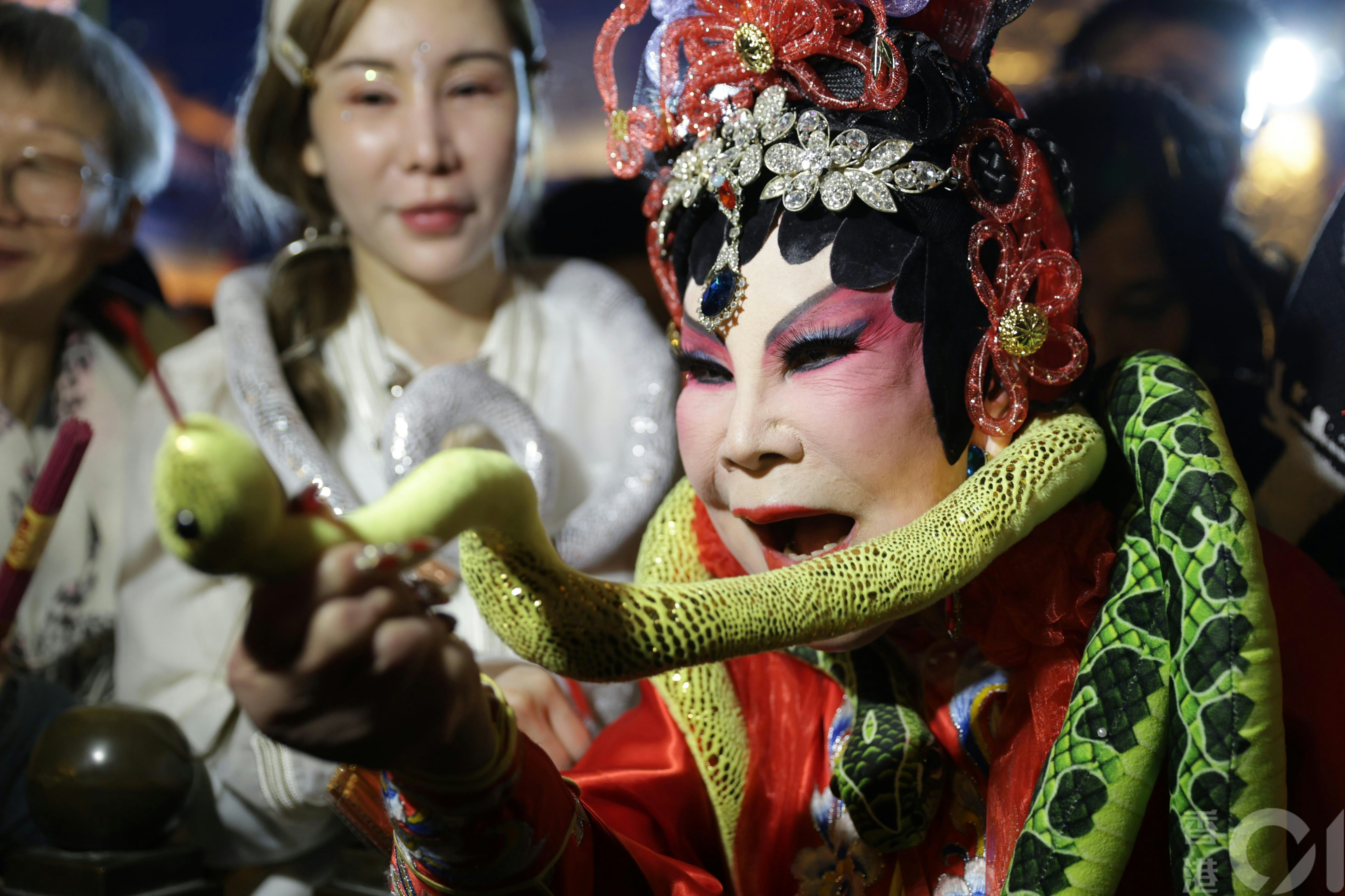 1月28日年廿九大除夕的黃大仙祠香火鼎盛。「頭炷香KOL」藝人黃夏蕙打扮成《白蛇傳》中的白娘子,頸繫一條膠青蛇,十分搶眼。(鄭子峰攝)