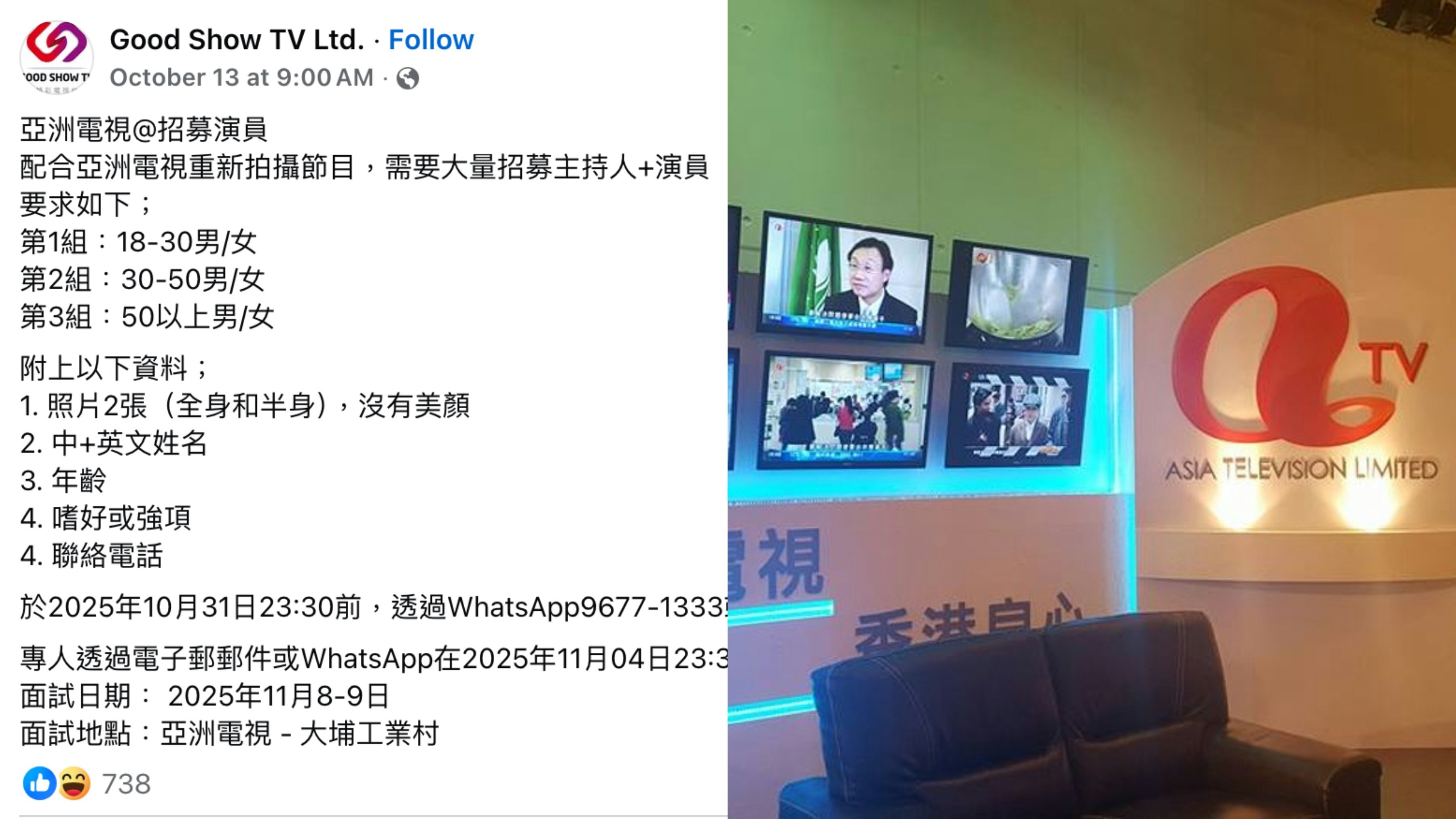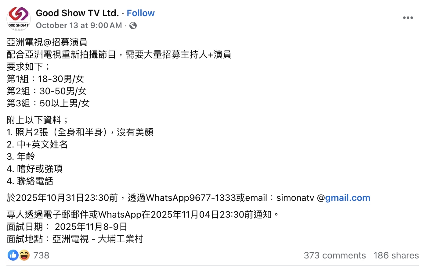 Good Show TV近日就在facebook出post招募新演員,更強調需要大量演員和主持人,分別是「第1組:18-30男/女」、「第2組:30-50男/女」及「第3組:50以上男/女」。不過網民就有很多疑慮,更質疑會否又是「搭雞棚」騙局,鑒於亞洲電視控股(ATV)於7月底欠款約3.82億港元,且未能在8月31日前公布2025年中期業績,公司並已於8月中被放款人委任接管人處理資產,上月再遭一名債權人入稟高等法院提出清盤呈請,案件排期至11月19日聆訊。同時,亞視大埔總部拖欠超過150萬港元電費,被中電入稟追討等等,網民都非常擔心冇電用、冇糧出。