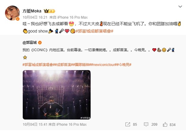本月1號內地瘋傳59歲的天王郭富城與老婆方媛的第三胎BB已於9月28日在香港養和醫院出世,傳聞又指今胎BB是男嬰,體重約7.1磅,甚至有傳郭富城為了照顧剛生產的方媛,就連成都演唱會可能會叫停。不過郭富城已如期在成都舉行了4號及5號的兩場演唱會,他與方媛在微博上隔空互動時,更是回應了第三胎BB未出世一事。方媛表示自己陀住BB腹大便便未能坐飛機到成都撐老公場,郭富城則以4個表情包來為待產的老婆加油打氣,證明BB仍未出世。