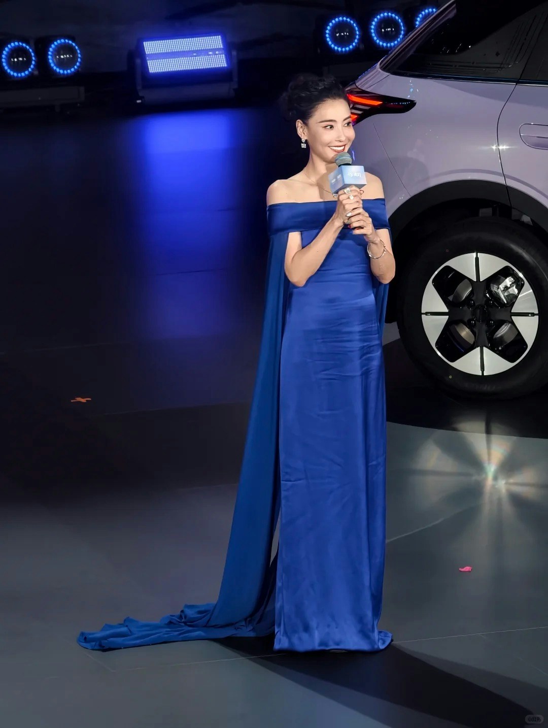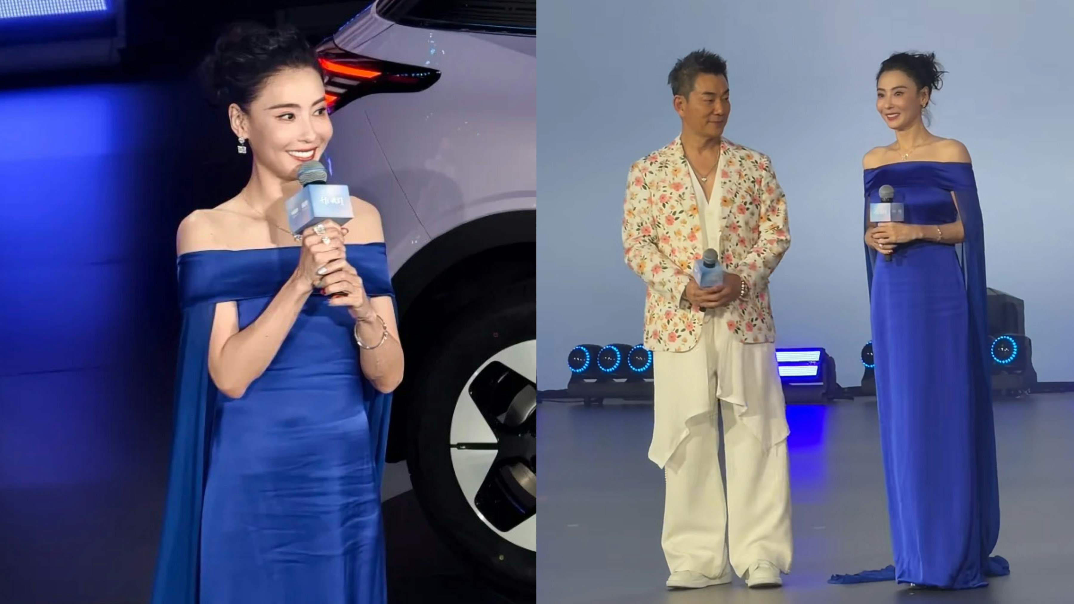 張栢芝以藍色露肩拖尾晚裝亮相,高貴大方又不失性感。(小紅書)