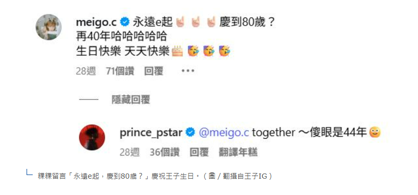 另一項被挖出的證據,則是今年4月王子生日時,粿粿在他IG貼文下的留言。當時粿粿開心地寫下:「永遠e起(一起),慶到80歲?再40年哈哈哈哈哈,生日快樂,天天快樂。」王子也親自回覆:「together ~傻眼是44年。」
