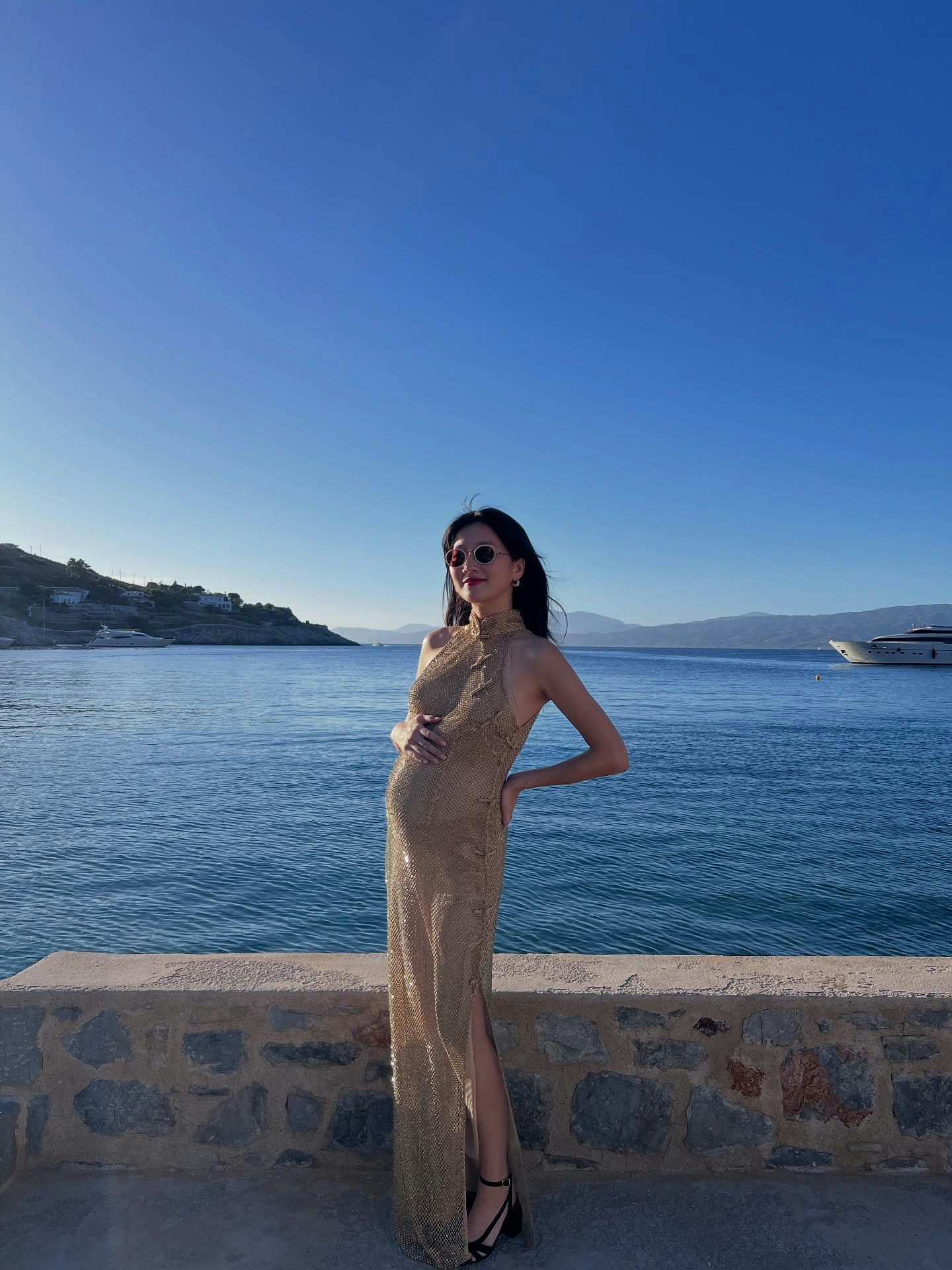 身穿金色高衩長裙的鄭瑤輕撫孕肚,一臉幸福。(IG@zanetacheng)