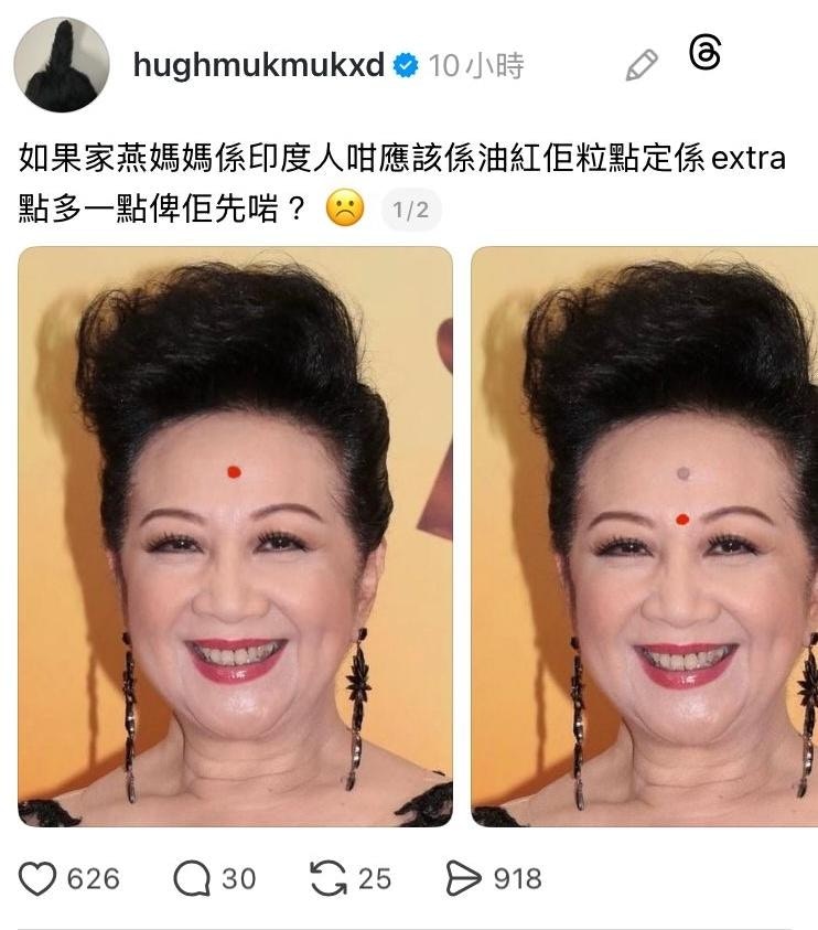 近日,有「脆友」在threads上開post討論,問:「如果家燕媽媽係印度人,咁應該係油紅佢粒癦,定係Extra點多一點畀佢先啱?」帖文隨即引起網民熱烈討論,有人直言:「點紅粒癦好睇啲!」,也有人指,應跟隨印度人傳統另外點上「吉祥痣」,又有人指家燕媽媽的「寶癦」已經足夠吉祥。最搞笑的是,有網民更將有關位置畫成九宮格,玩過三關。有關帖文在一日內竟有11萬次瀏覽!