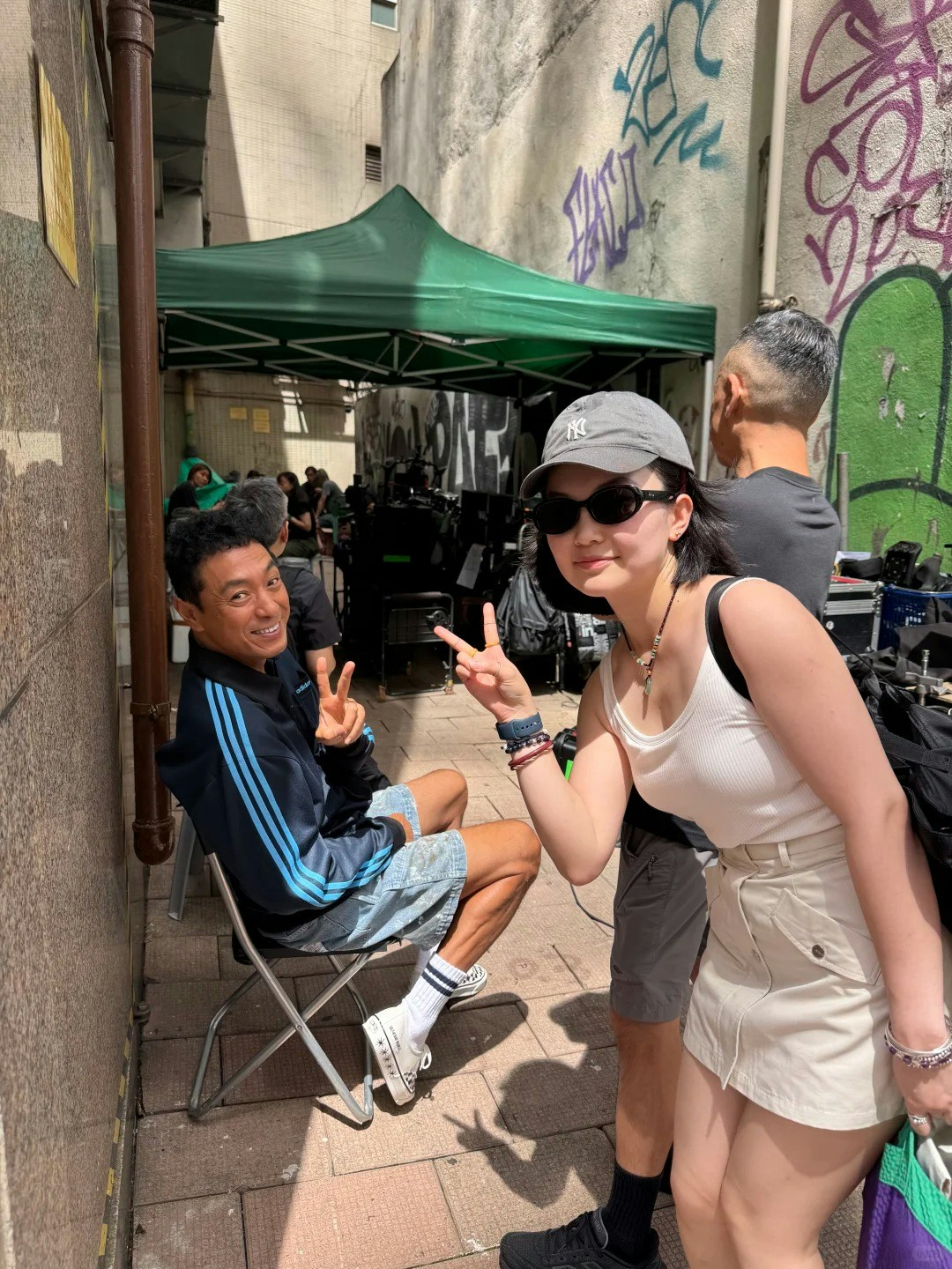 從網民分享的相片可見,當時劇組正值放飯時間,身穿運動服、牛仔短褲的姜皓文並未有登上私人座駕,或到舒適的冷氣地方休息,反而隨性地坐在拍攝現場的一張膠櫈上,與劇組工作人員「吹水」,完全沒有明星架子。當該網民上前「集郵」時,姜皓文更是有求必應,不僅展露燦爛的笑容,更主動望向鏡頭做出勝利手勢,盡顯友善隨和一面,難怪該遊客亦大讚:「btw港星真的好隨和哈哈哈,對視後就已經對我的鏡頭比✌️了,祝拍攝順利,期待上映」。姜皓文也親自回覆對方:「香港歡迎你。」一盡好客之道。