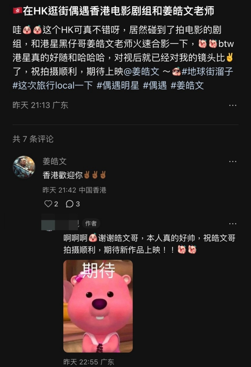 雖然已貴為「金像男配」,但姜皓文依然貫徹貼地作風。近日天氣不穩,姜皓文繼續為新戲趕工,期間就被遊客野生捕獲。該遊客其後在社交平台以「在HK逛街偶遇香港電影劇組和姜皓文老師」為題發文,興奮寫道:「哇這個HK可真不錯呀,居然碰到了拍電影的劇組,和港星黑仔哥姜皓文老師火速合影一下!」